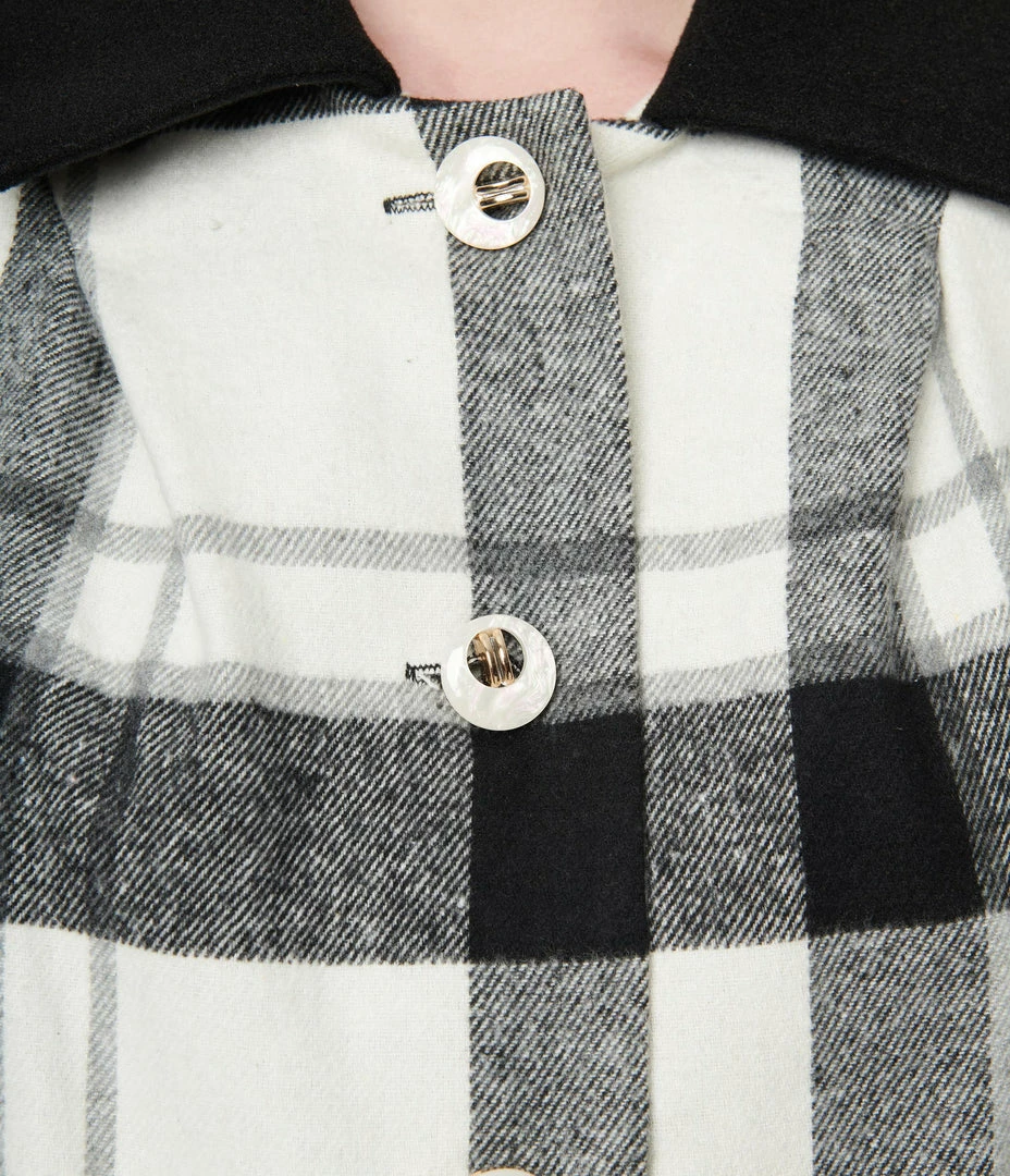 The Ahoy There Coat is crafted in a brushed woven fabric that dances with a pattern of white and blackplaid while the button up front leads to an attached self tie neck bow. Complete with three quarter length sleeves and side pockets!