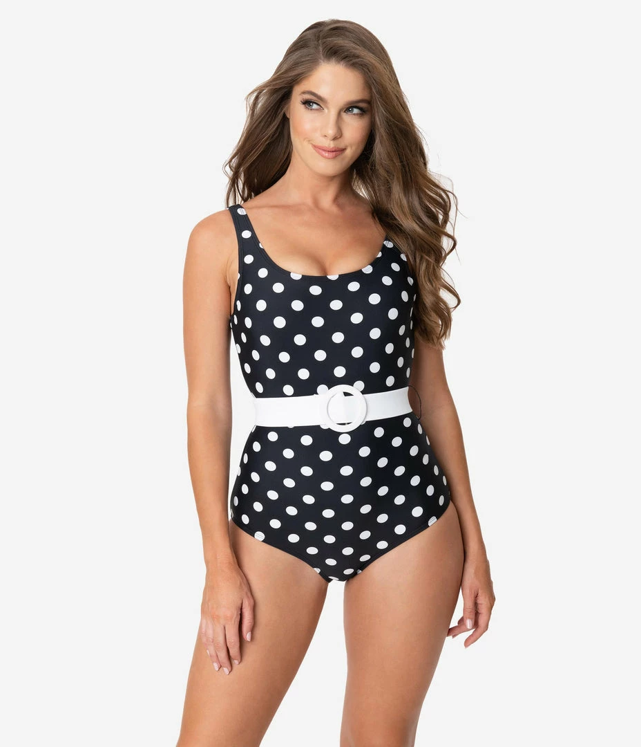 Flash Sale ๐งจ Unique Vintage Black & White Polka Dot Belted Huntington ๐ฉฑ Swimsuit โญ