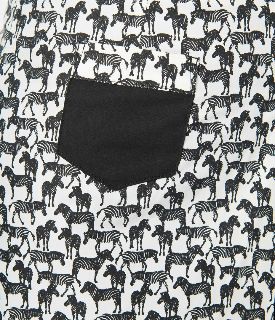 This adorable set of shorts are crafted in sturdy woven black fabric with a playful skirt set in a black and white zebra print dances over your hips for a charming skort style. Outfitted with a back zipper and a darling coin pocket.