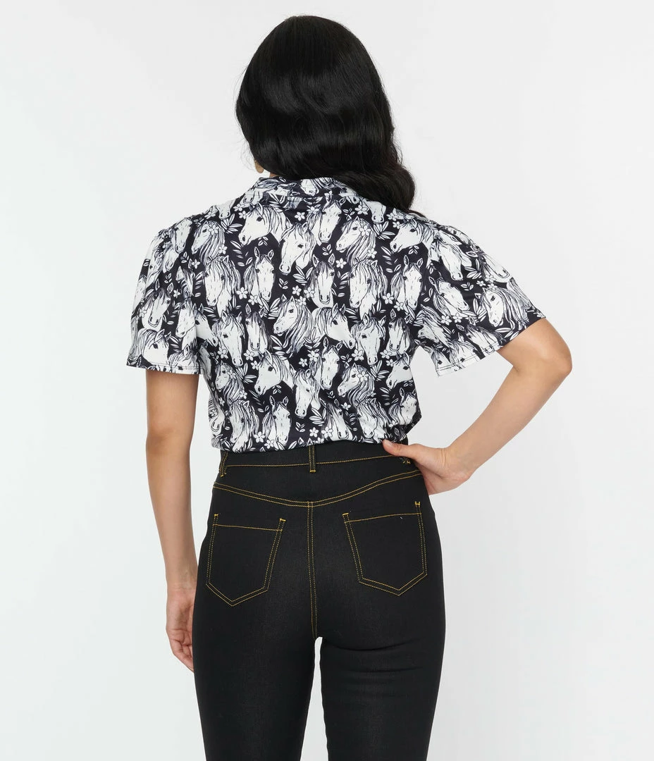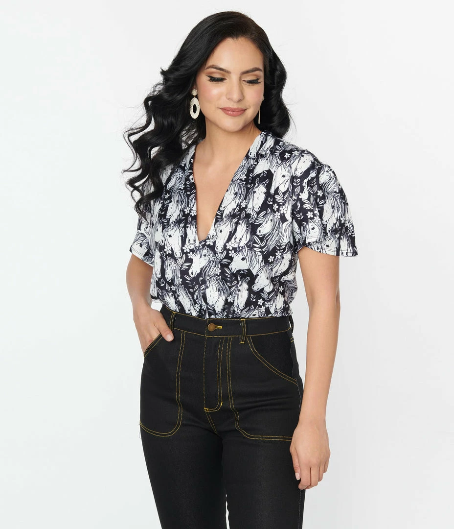 A sultry bodysuit crafted in black knit with a herd of white wild horses printed throughout. Outfitted with short flutter sleeves and a plunging V-neckline. Complete with a snap button closure.