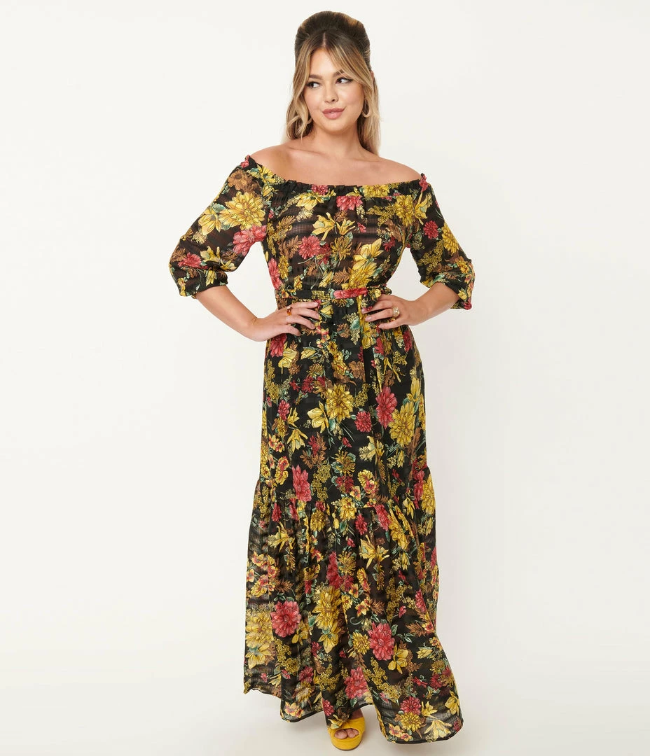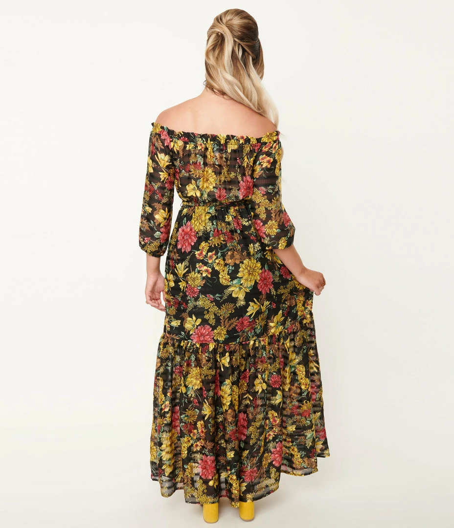 Crafted in a lightweight crepe that features a beautiful floral print of yellow, brown, and red throughout a black plaid pattern. The unlined bodice boasts a sultry off the shoulder neckline, while the elastic waist is embellished with a matching sash as the sweeping maxi skirt is complete with a half slip lining for comfortable all day wear!