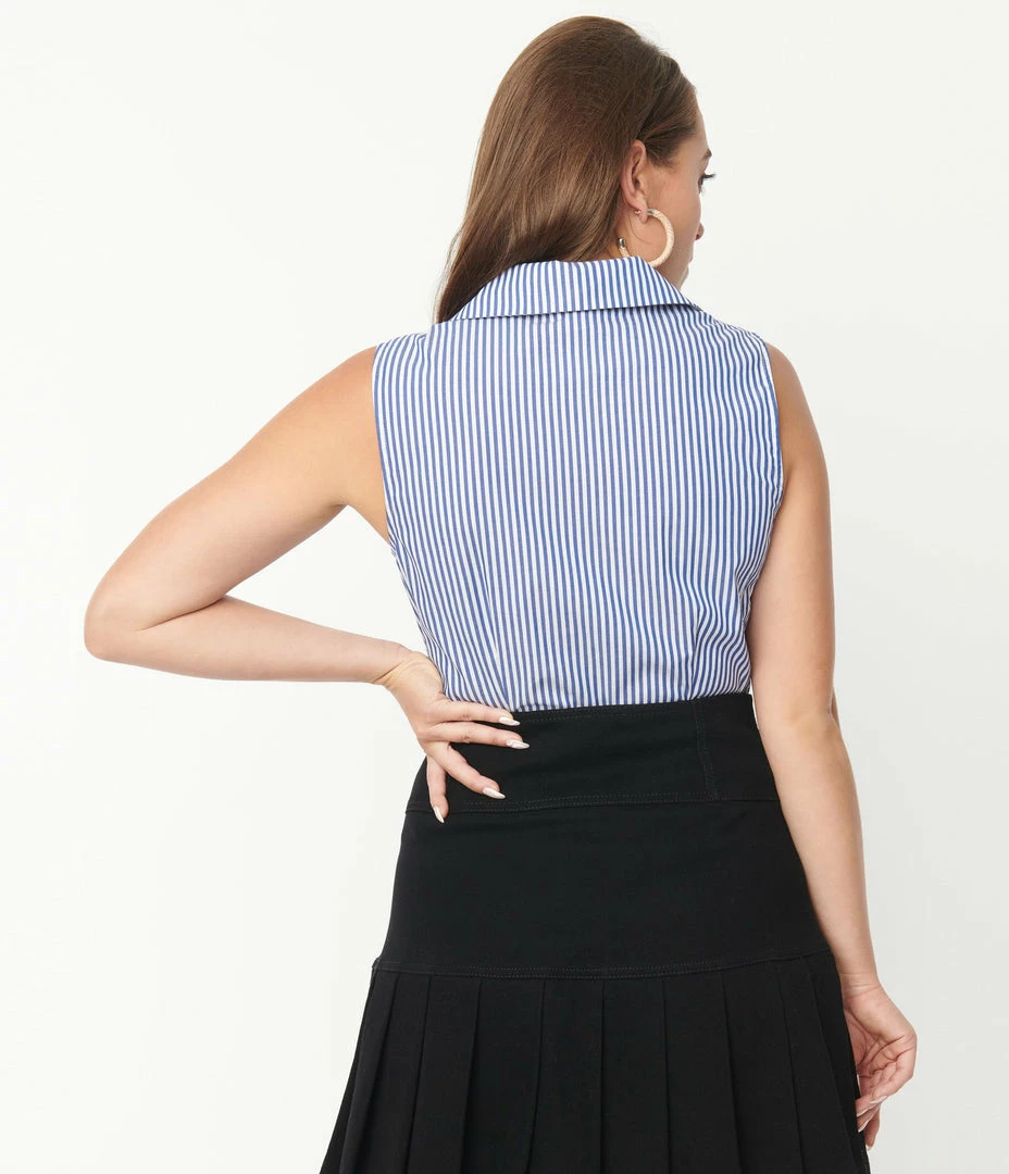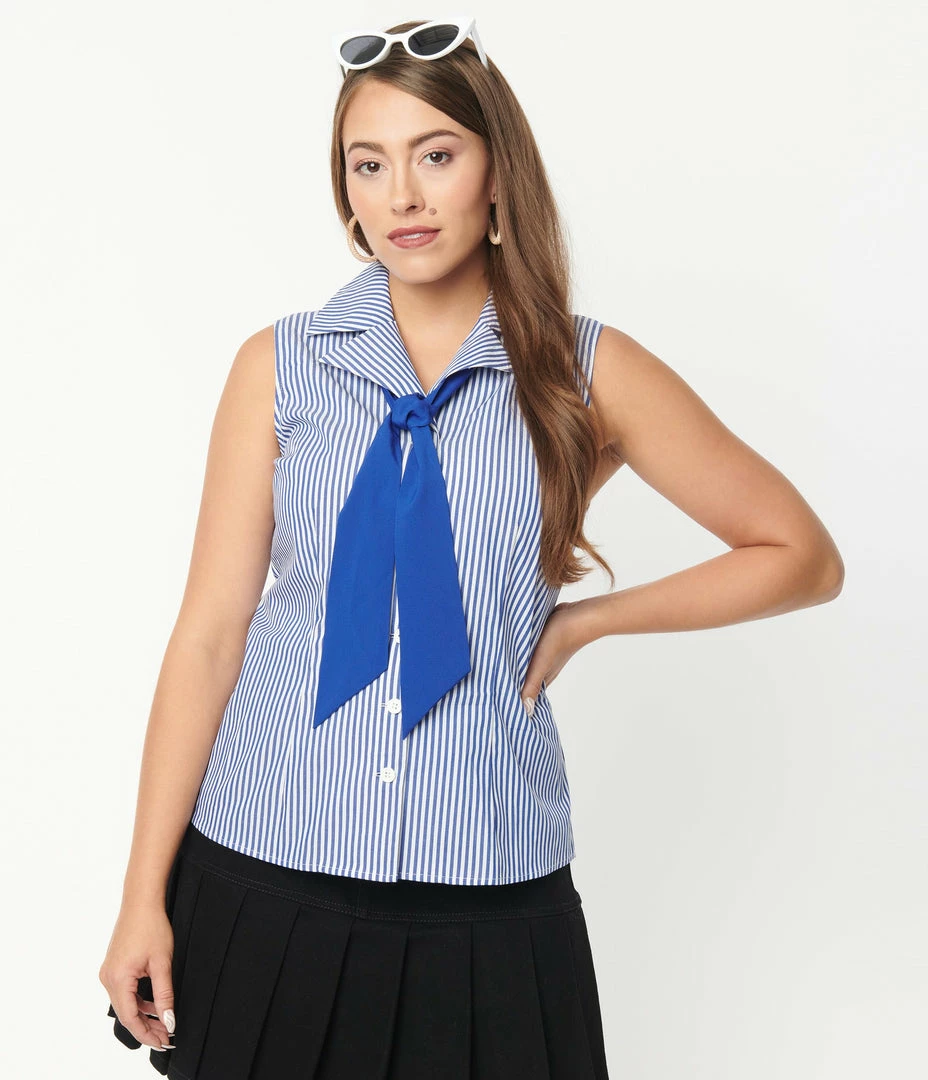 Get the inspiration going, darling! Serve up some excitement in this darling blouse from Unique Vintage, crafted in a lightweight woven fabric that dazzles with a blue and white striped pattern throughout. The Truvy Top features button up front, leading to a classic notched collar and embellished with a removable solid blue neck bow. The darted bodice features a sleeveless silhouette while the long torso drops into a curved hem!