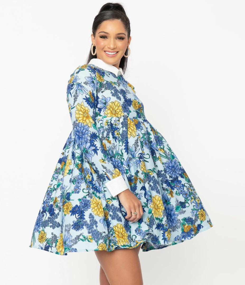 Hot Sale ✔️ Unique Vintage Blue & Yellow Floral Print Peggy Babydoll 👗 Dress 🎁