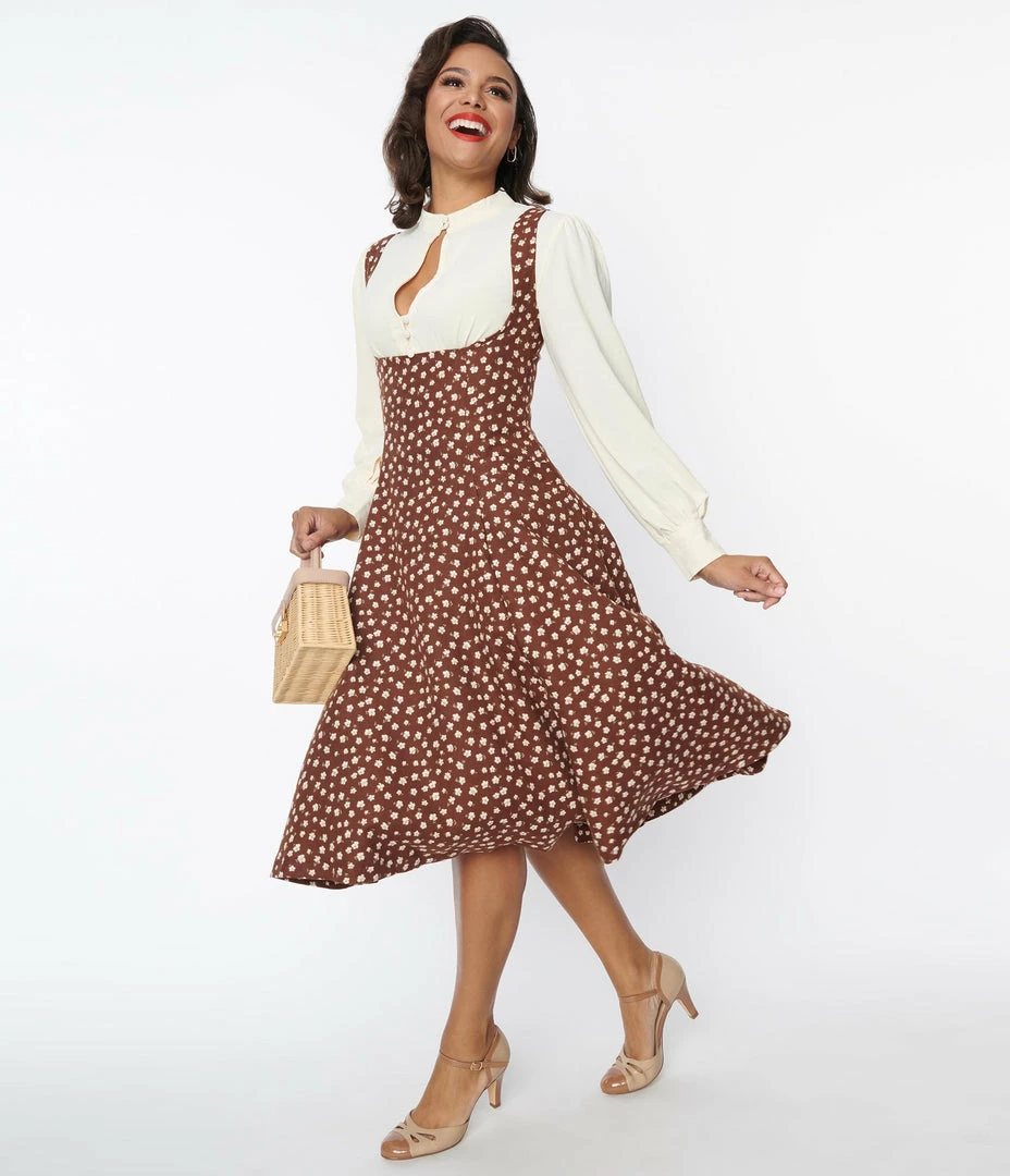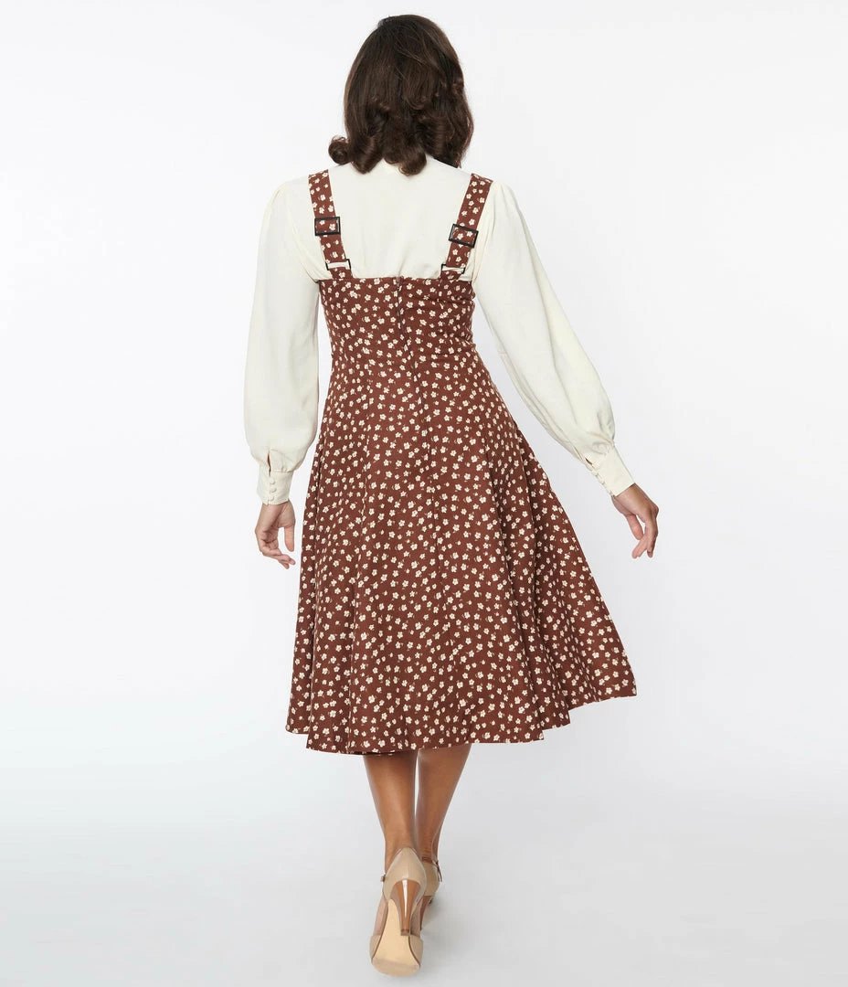 Discount 🌟 Unique Vintage Brown & Cream Floral Amma Suspender Swing 👗 Skirt 😉