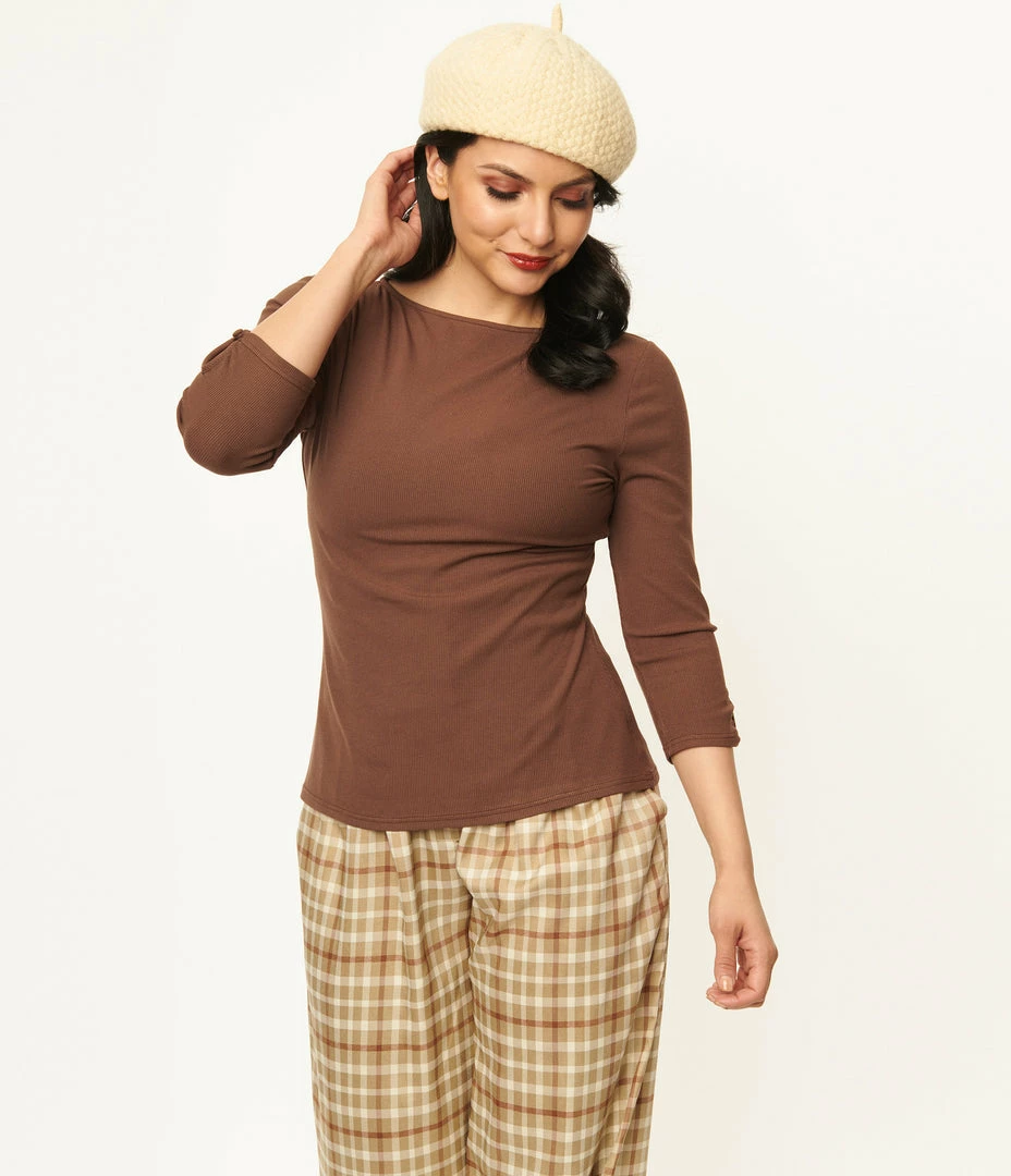 This chic brown top is crafted in a soft knit blend that stretches comfortably around your form, complete with a bateau neckline and three-quarter length sleeves.
