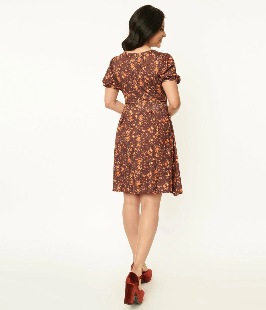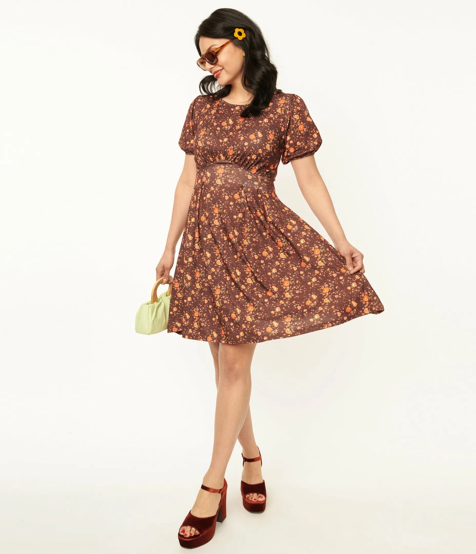 Stop them in their tracks, doll! An essential flare dress for the vintage dame, from Unique Vintage and cast in a brown soft knit stretch that dazzles with orange florals throughout. The mid-century silhouette boasts a scoop neckline framed by short puff sleeves outfitted with elastic cuffs.The empire waist boasts subtle pleating as the flare skirt dances above the knees!
