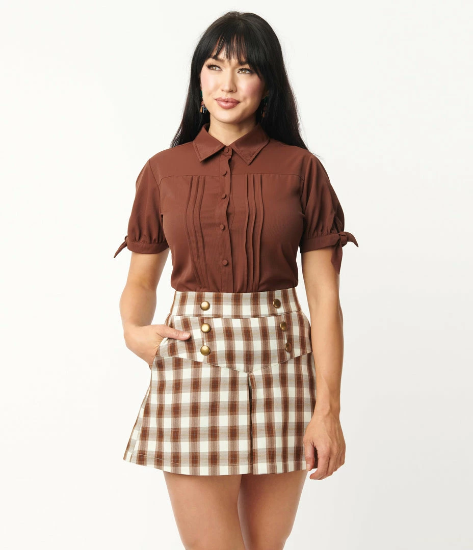 These adorable shorts are crafted in a brown and tan plaid woven fabric, outfitted with faux buttons and a functional back zipper. Complete with side pockets!