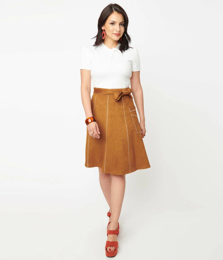 This adorable skirt is crafted in a brown faux suede. Complete with a matching sash, back zipper, and side pockets.