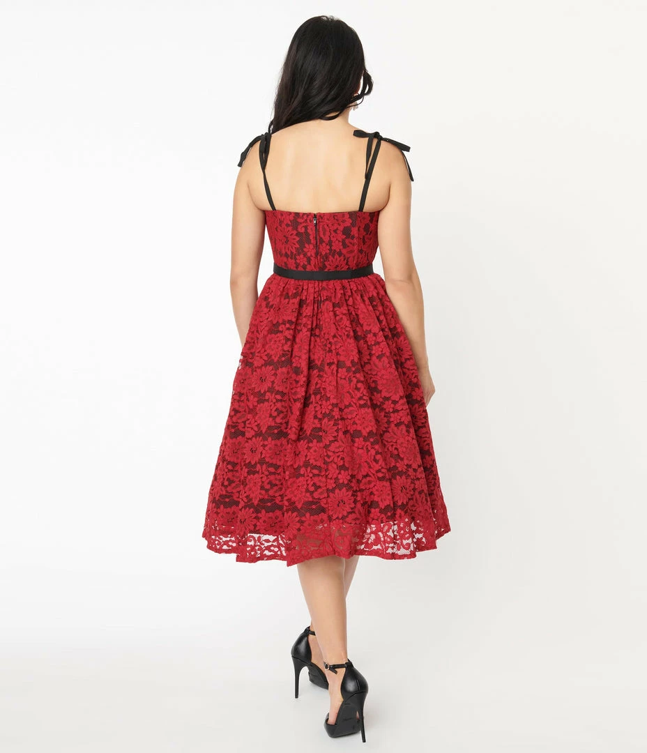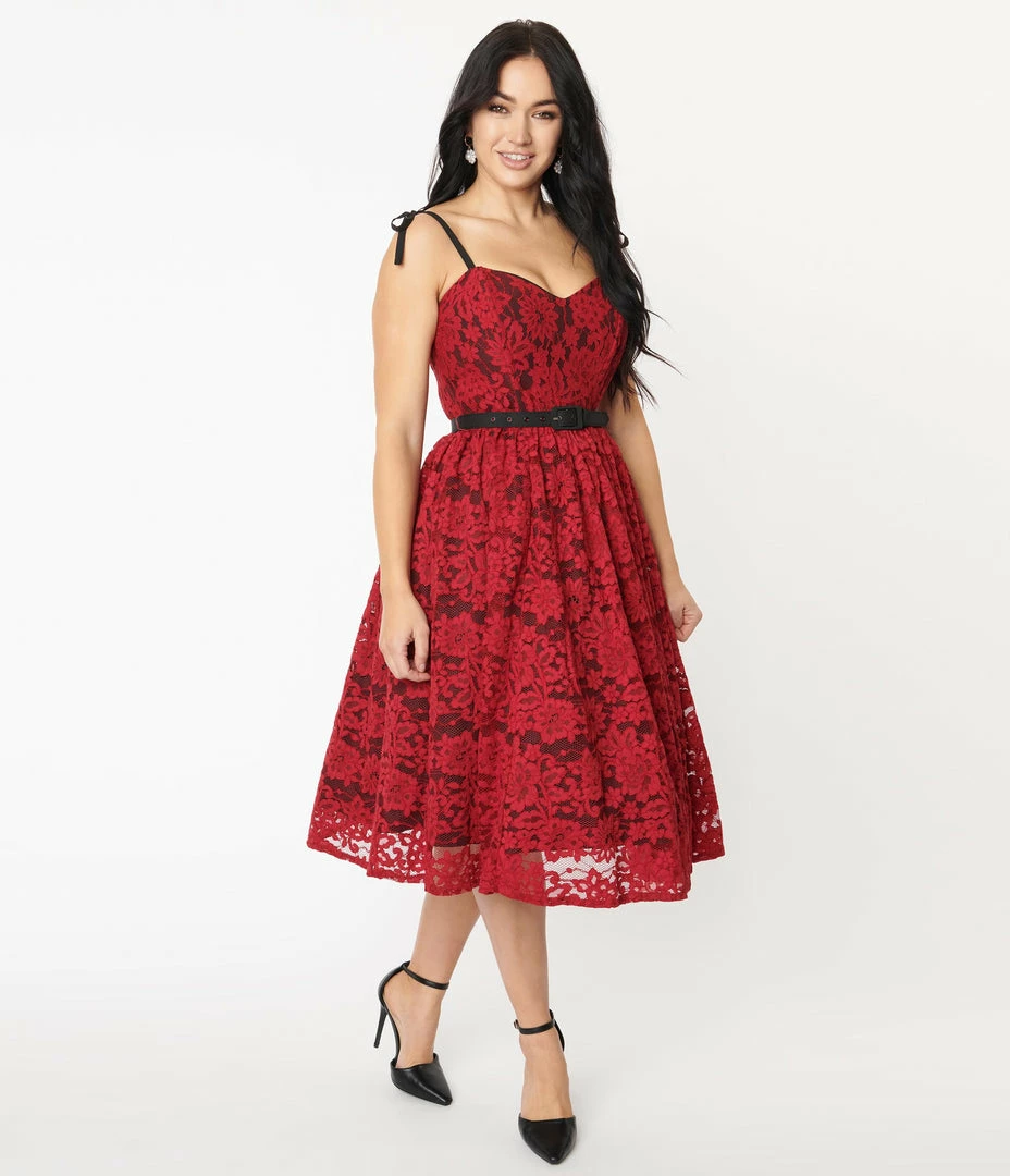 Dare to be different, dears! Fresh from Unique Vintage, the Dita Dress is a gorgeous burgundy red lace silhouette in a striking vintage design that cascades over black lining. The sweetheart bodice features boning for structure while the spaghetti straps are self tied for a versatile fit. The seamed waist can be cinched with a matching belt and a back zipper while the gathered swing skirt drops to your knees for a graceful and feminine style!