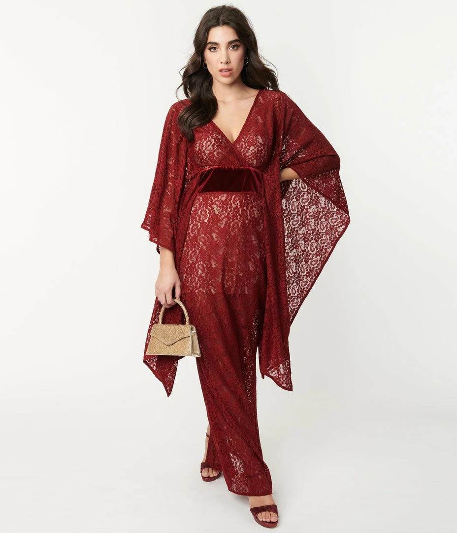 The Desmond Dress is a fabulous fitted silhouette crafted in a marvelous burgundy floral lace. The sultry surplice neckline and velvet banded waist are framed by beautiful kimono-style long sleeves while the fitted maxi skirt drops to the floor!