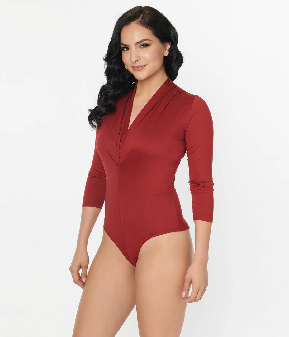 Coupon 🤩 Unique Vintage Burgundy Gathered Neckline Friday Night Bodysuit Clothing 🔥