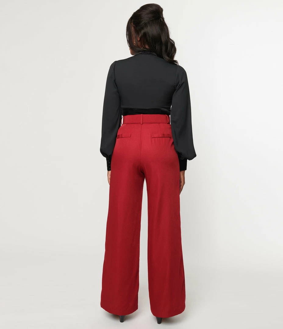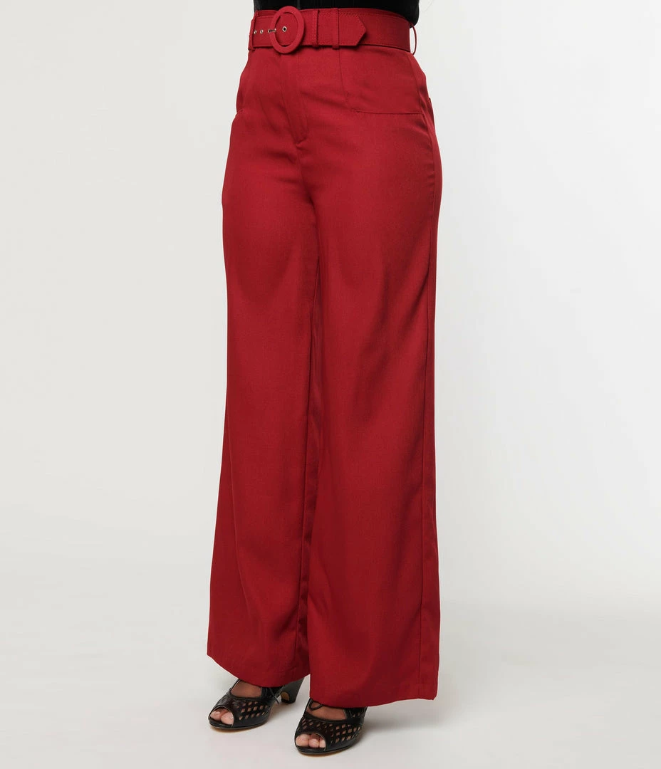 The Ginger Pants are crafted in a lightweight woven and set in solid burgundy red. The high waisted silhouette is accented with wide legs to create a retro silhouette that flatters. Complete with front zipper, side pockets, and matching belt.