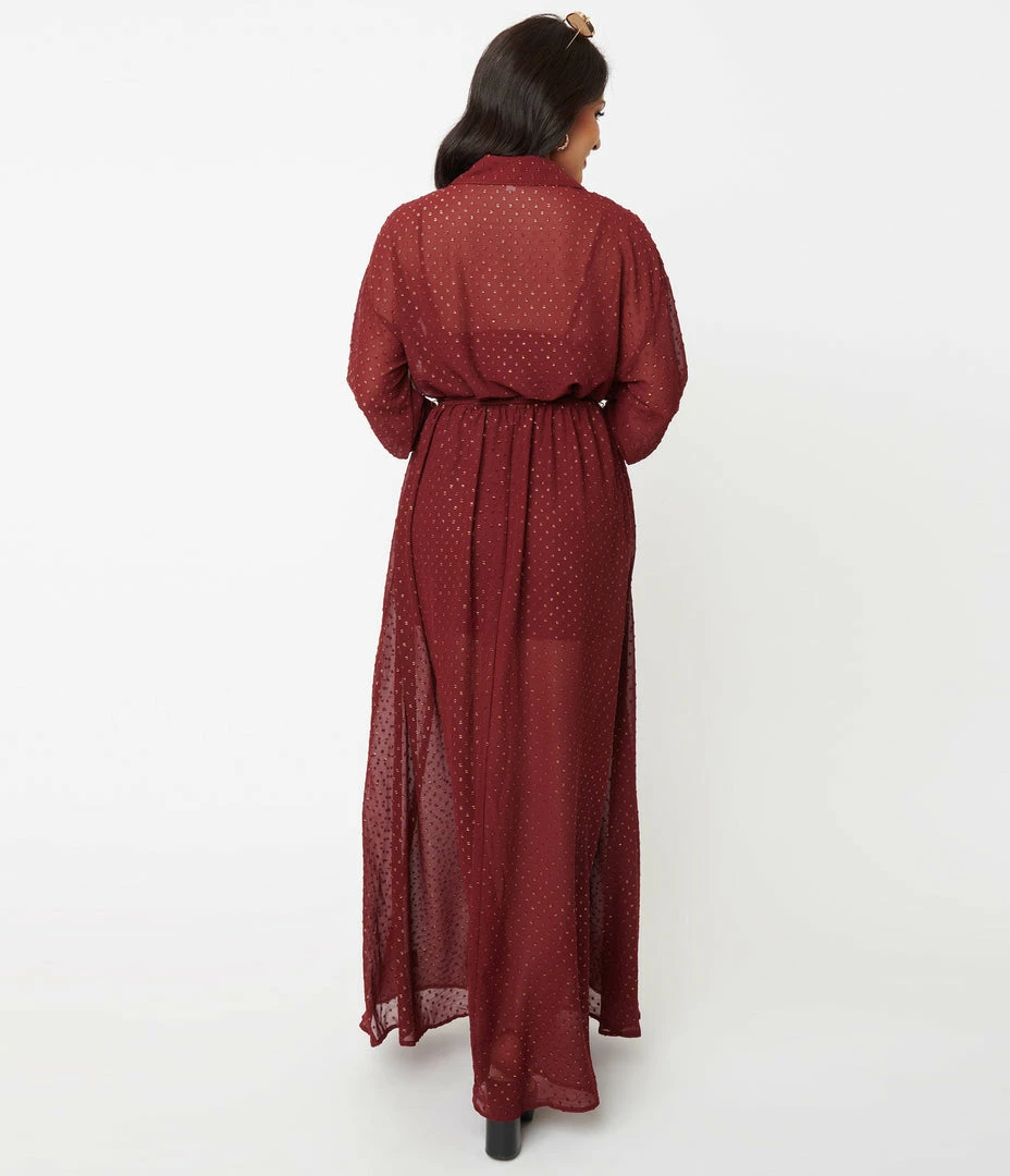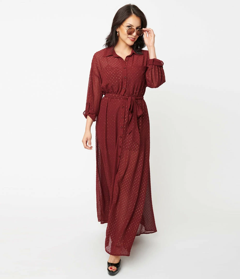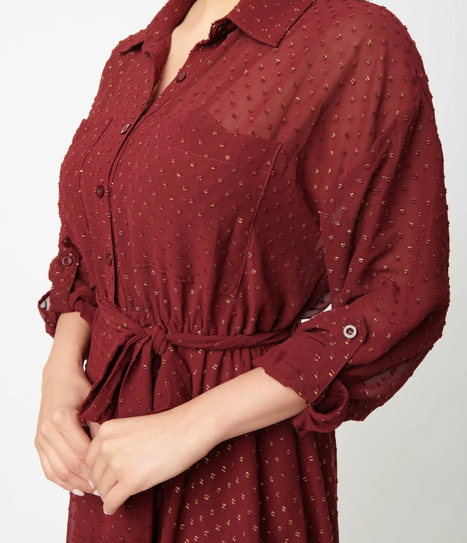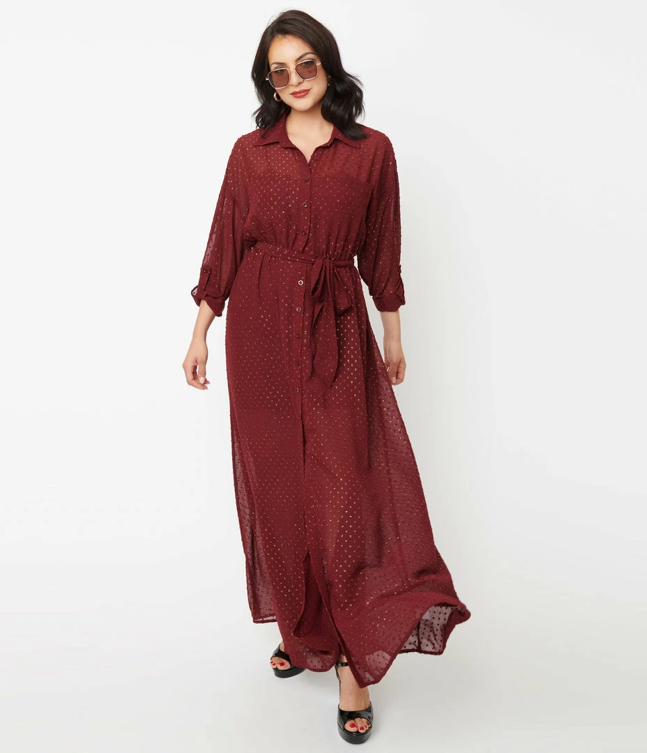 You never stop working your charms, dolls! Give yourself free reign in this fabulous maxi shirtdress, a fresh retro inspired silhouette from Unique Vintage. The Blanche Dress is crafted in a gorgeous burgundy red that shimmers with golden clip dots throughout. The button up front leads to a classic collar, framed by long sleeves that boasts button tabs for an easy roll up. The elastic seamed waist is cinched with a matching sash while dual chest pockets and hidden side pockets lend modern convenience. Complete with removable burgundy red lining for all day comfort!