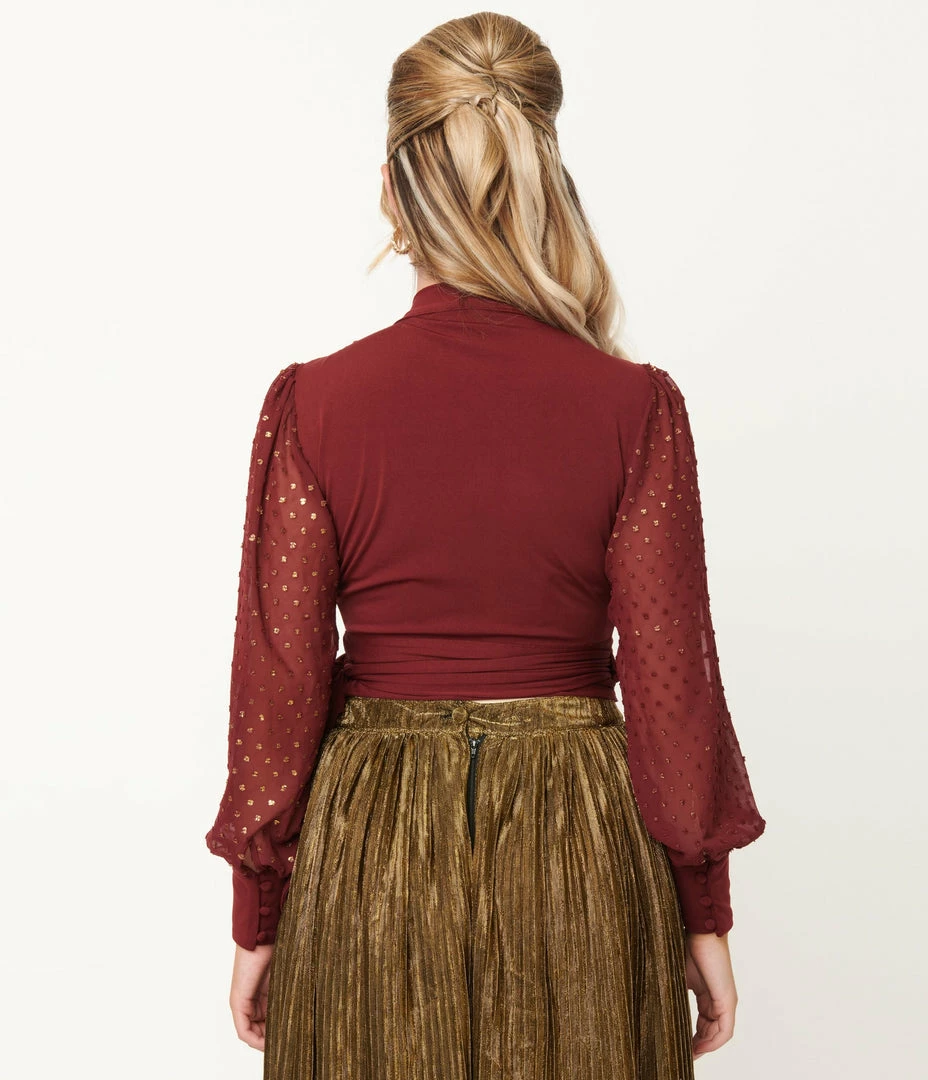 Something wonderful is about to happen, darling! Raise the bar on enchantment with the Giselle Top, fresh from Unique Vintage in a gorgeous burgundy red knit that features attached waist ties for a flattering full wrap cinch. The sheer long sleeves dance with gold clip dots while the button cuffs lend vintage grace to your silhouette!