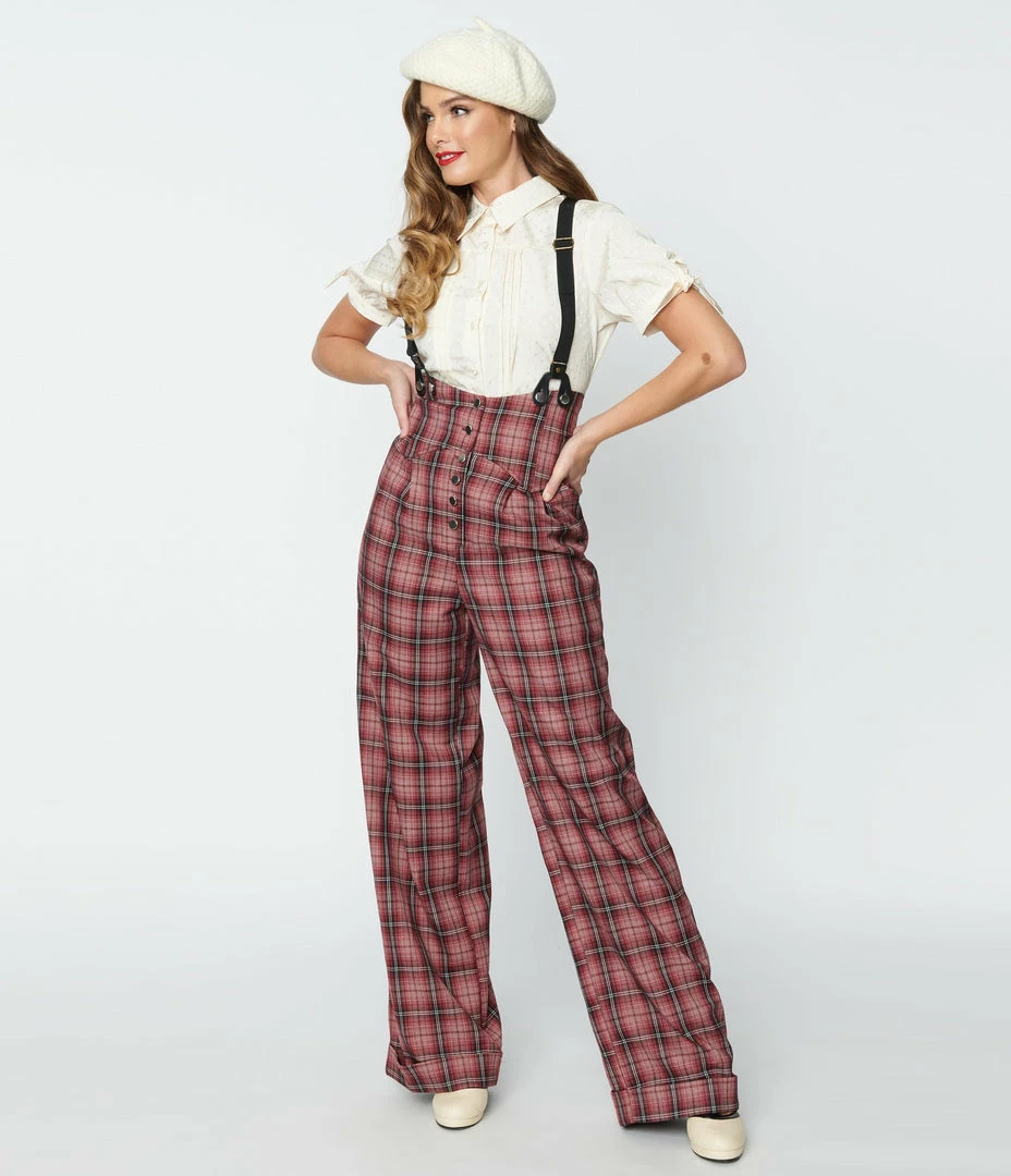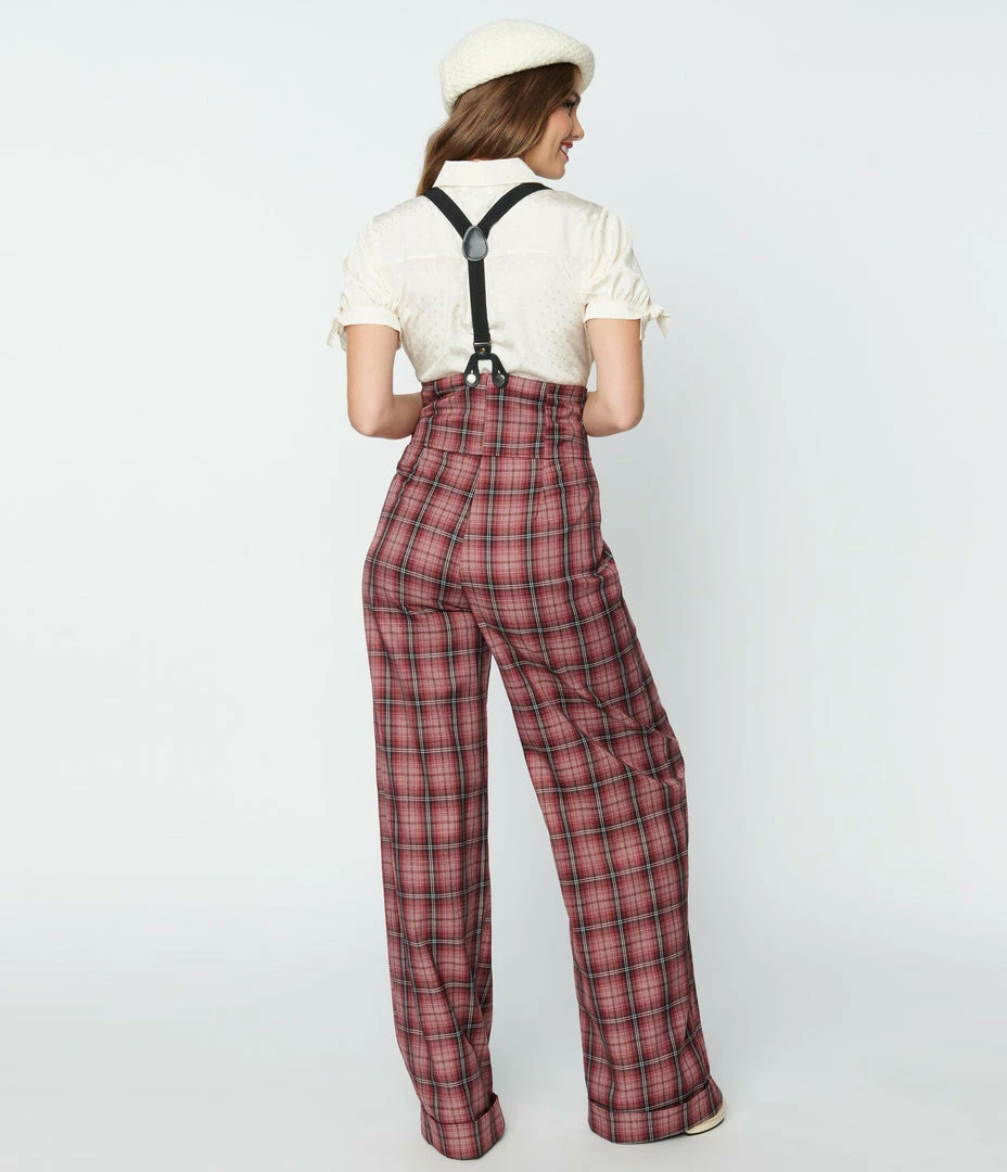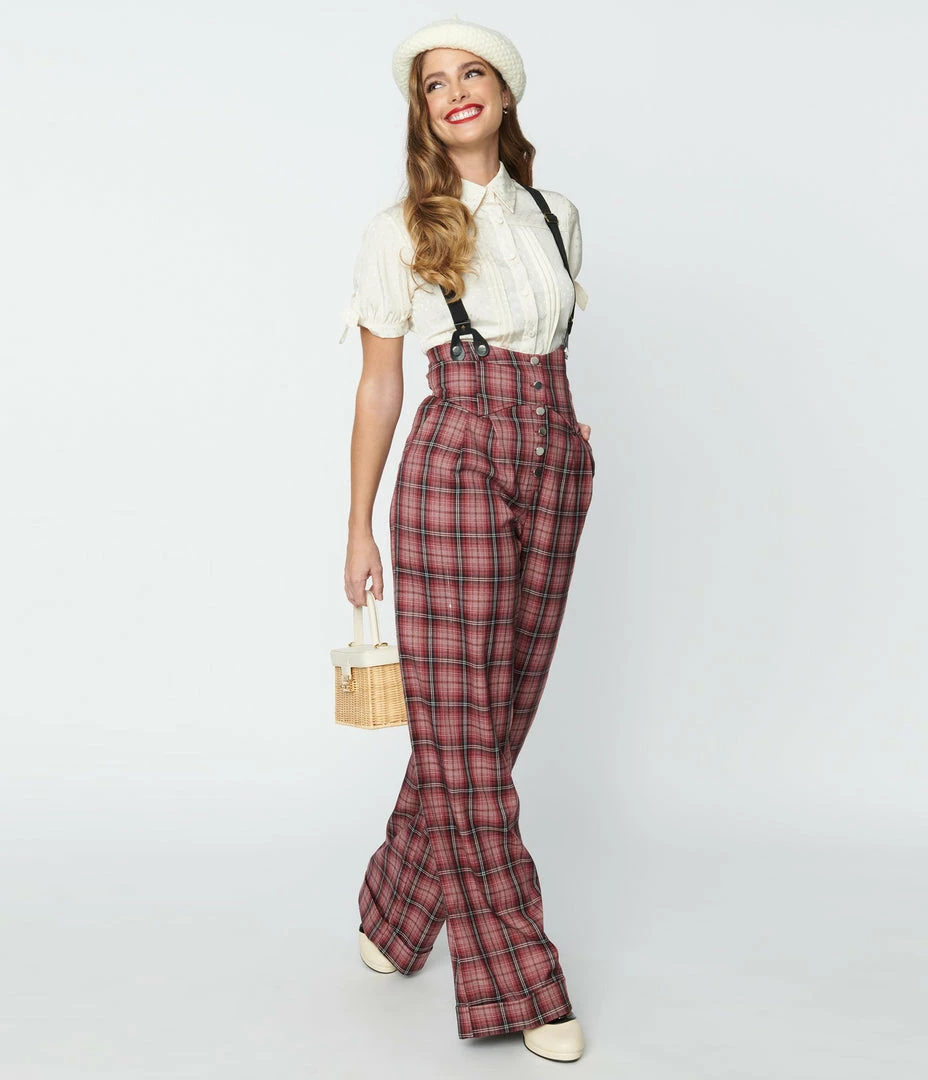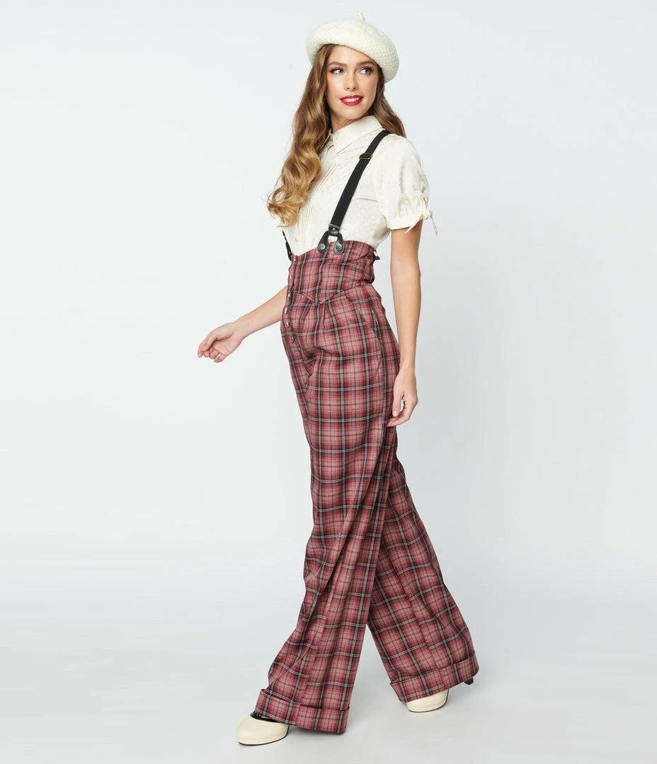 These fabulous suspender pants from Unique Vintage, boasting a marvelous silhouette in a plaid pattern of burgundy, grey, and black throughout the woven fabric. The wide banded high waist cinched in with a darling button up front and secured by adjustable suspender straps. Complete with side pockets.