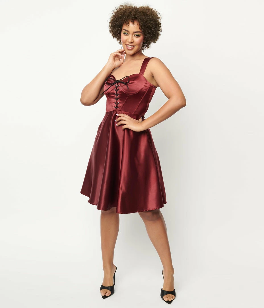 Flash Sale 😉 Unique Vintage Burgundy Satin Corset Flare 👗 Dress Trending ⭐