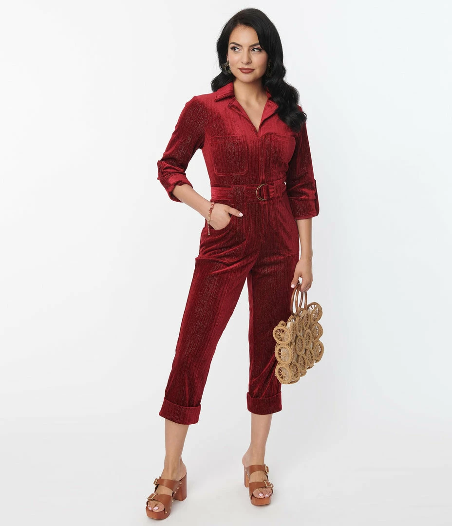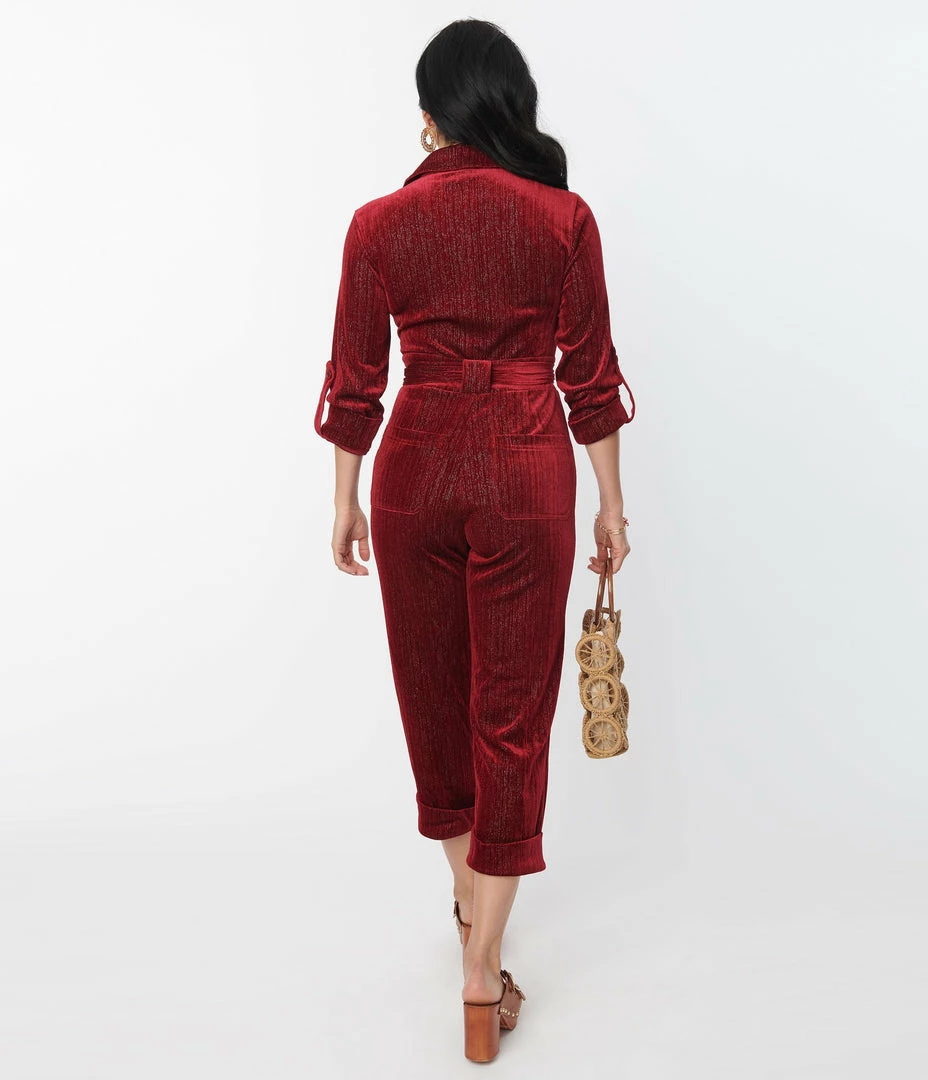 Best Pirce ⭐ Unique Vintage Burgundy Velvet Shimmer Trixie Jumpsuit New Arrivals! 🔔