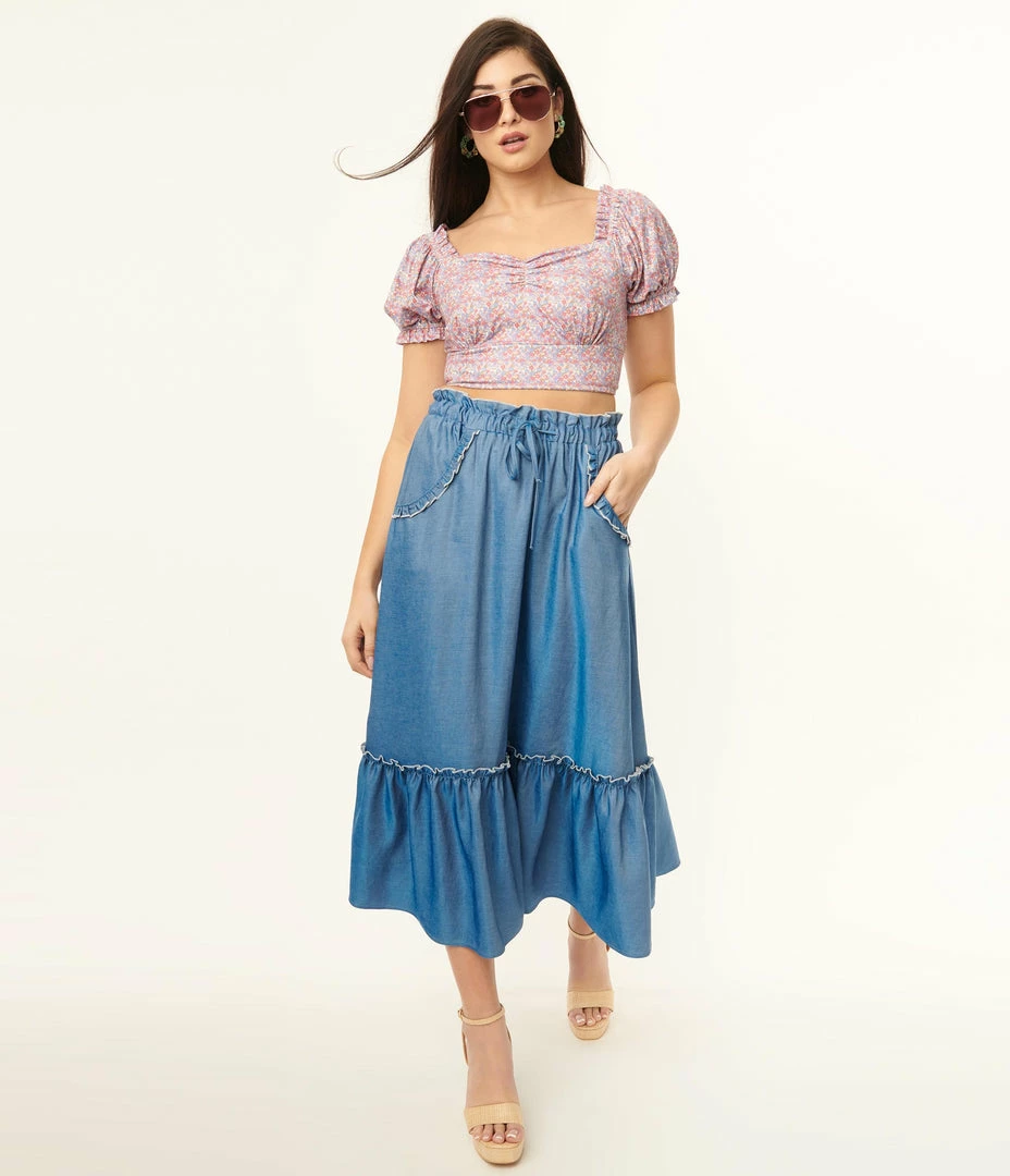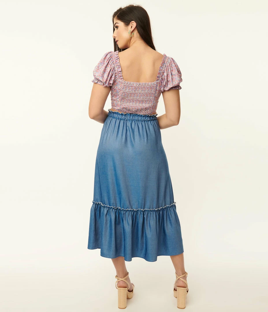 This charming separate from Unique Vintage is crafted in a soft cotton blend cast in a gorgeous blue chambray. The elastic banded waist nips you in, while the pull tie cinches you in with a self tie bow. The side pockets are accented with sweet ruffles, while the gathered tiers drop dance around your calves!