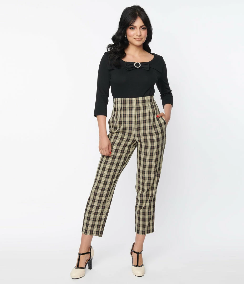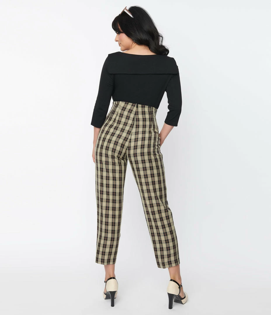 Promo ✨ Unique Vintage Cream & Black Plaid Front Pleat Pants Sale 👏