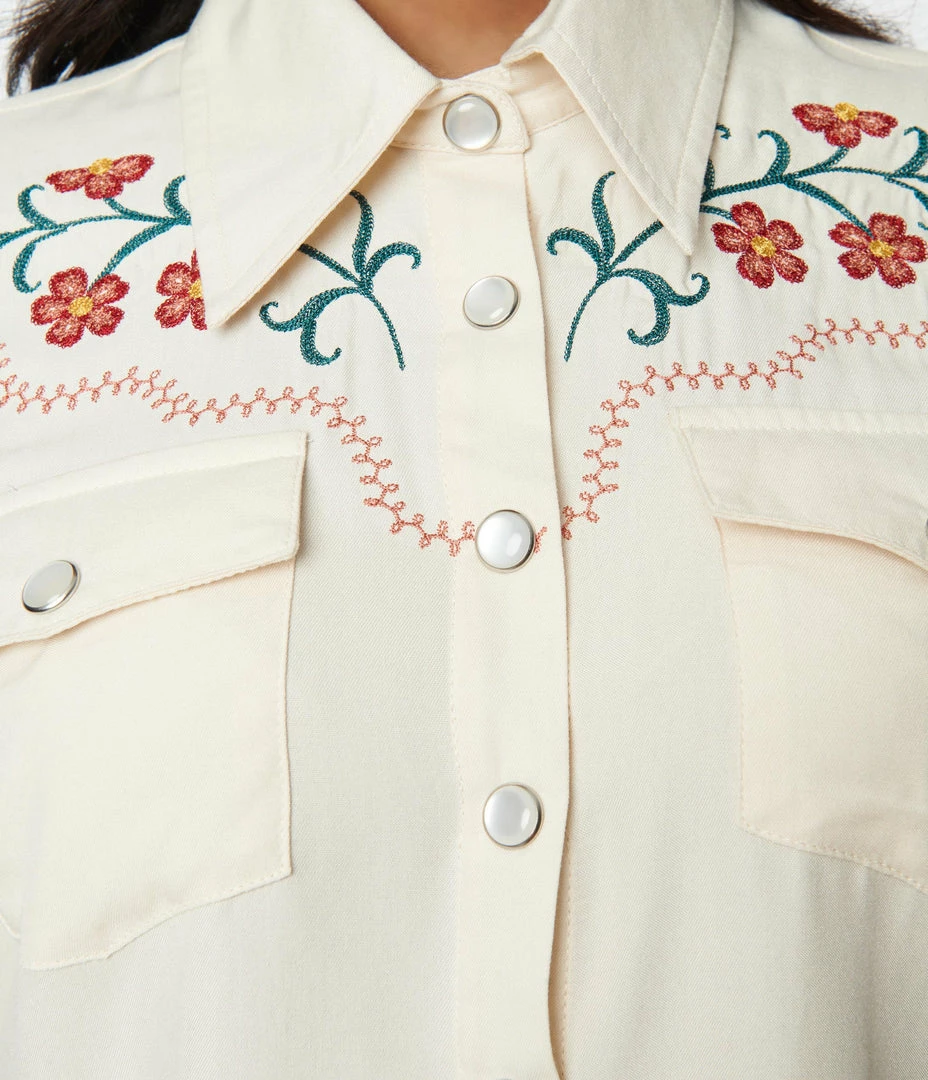 This adorable blouse is crafted in a creamy and silky woven fabric that features embroidered florals along the collared yoke. Outfitted with a button up front, button flap chest pockets, and button cuffs.