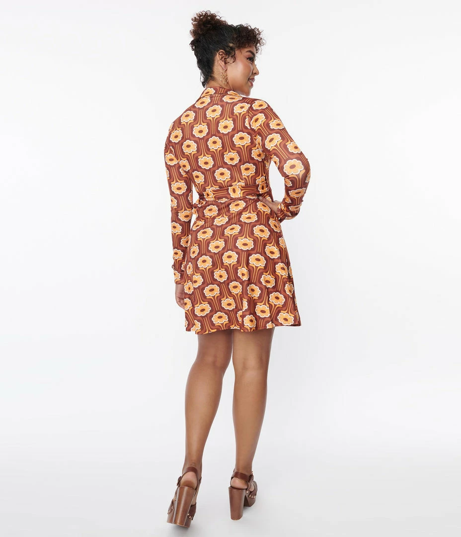 This sweet flare is crafted in a stretch knit that boasts a print of retro geometric daisies in brown, yellow, and white. Topped by a classic collar, attached waist ties for a secure wrap, and side pockets.