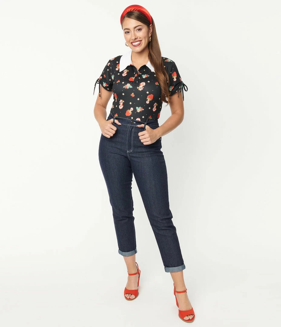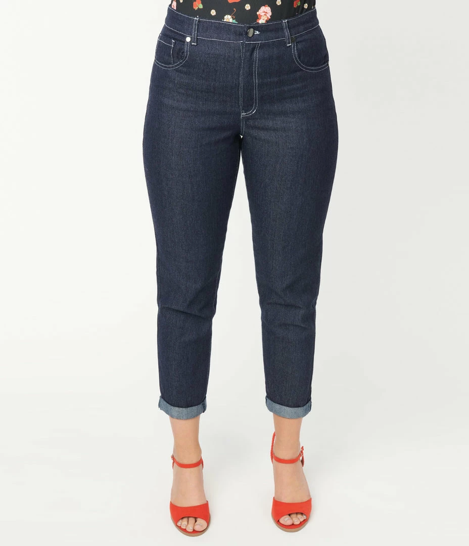 These classic capris are crafted in a sturdy dark blue denim with contrast seaming throughout. The Marilyn Capris are cinched with a classic zipper and button fly while side and back pockets lend modern convenience. Complete with faux rolled cuffs that provide sweet vintage appeal!