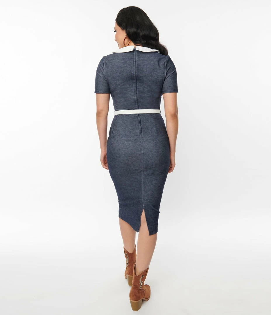 An unstoppable wiggle dress, crafted in a dark blue denim with a dash of stretch and accented with white piping. Outfitted with a Peter Pan collar and tie, faux side pockets, a back zipper, and a back vent.