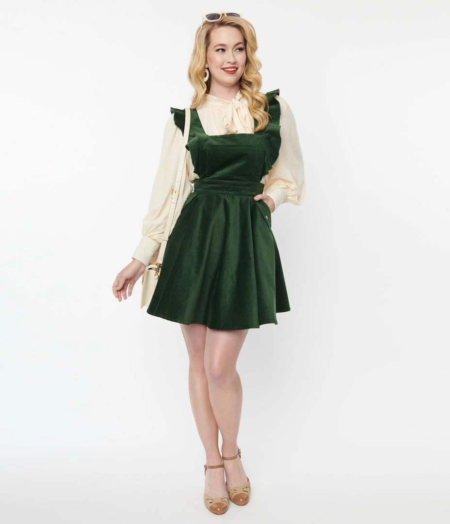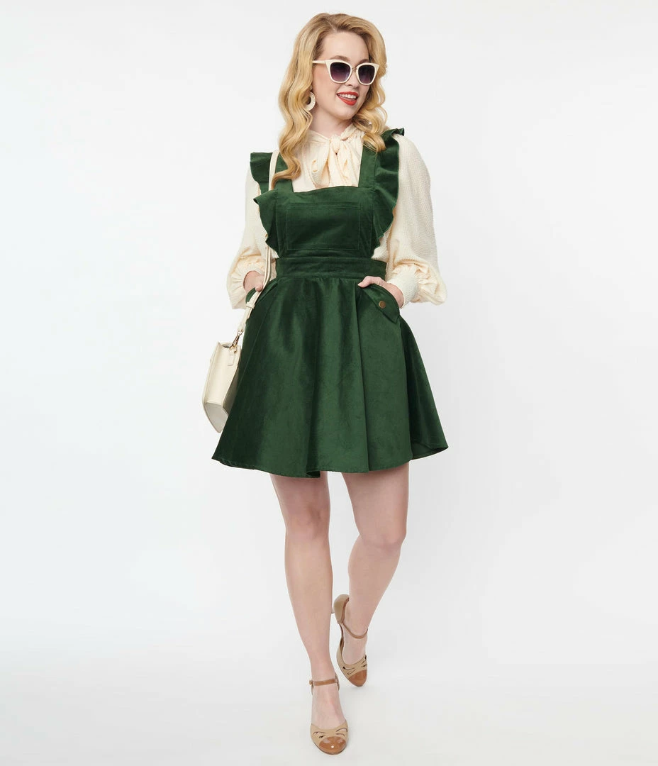 This rockabilly pinafore is crafted in a dazzling emerald green corduroy and features button adjustable straps with a ruffled accent. Complete with a back zipper and functional side and chest pockets.