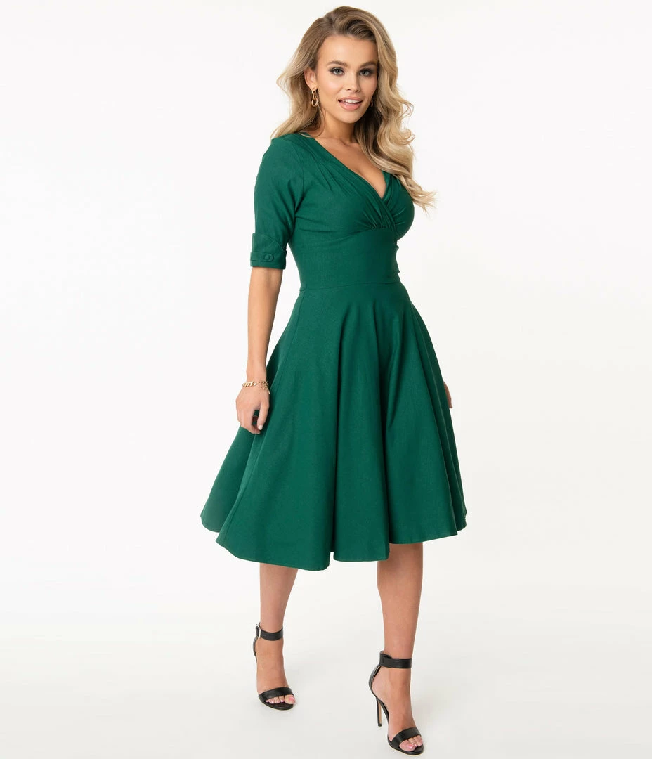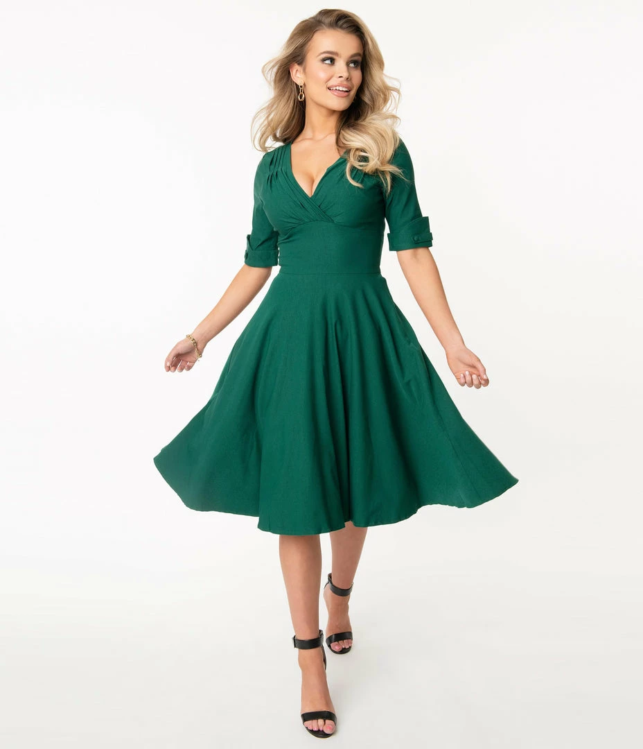 Let Delores get domestic with you, darling. A bewitching emerald green swing dress rich in 1950s vintage appeal fresh from Unique Vintage, Delores is unparalleled! Boasting a gathered surplice V-neckline, trim and tailored half sleeves with darling button details and a thick-banded natural waistline that creates a minimized silhouette, this vintage green dress is sure to flatter your figure. An ample A-line swing skirt billows to knee length in soft pleats, zipping slyly up the back. Crafted in a supremely soft stretch blend in stunning retro structure, this green vintage dress forms an understated yet flattering design. Youโll be fabulously floored by the authentic look of this nice-girl-next-door vintage reproduction dress!