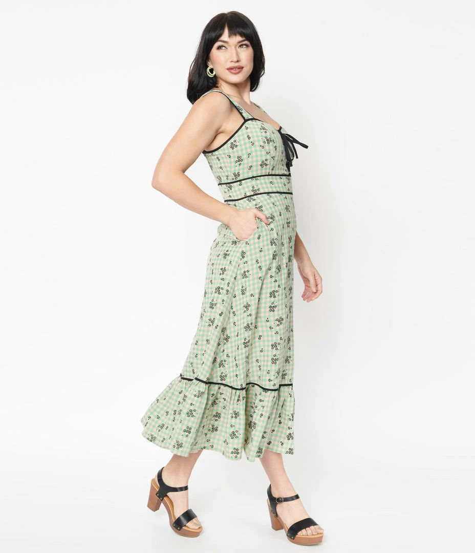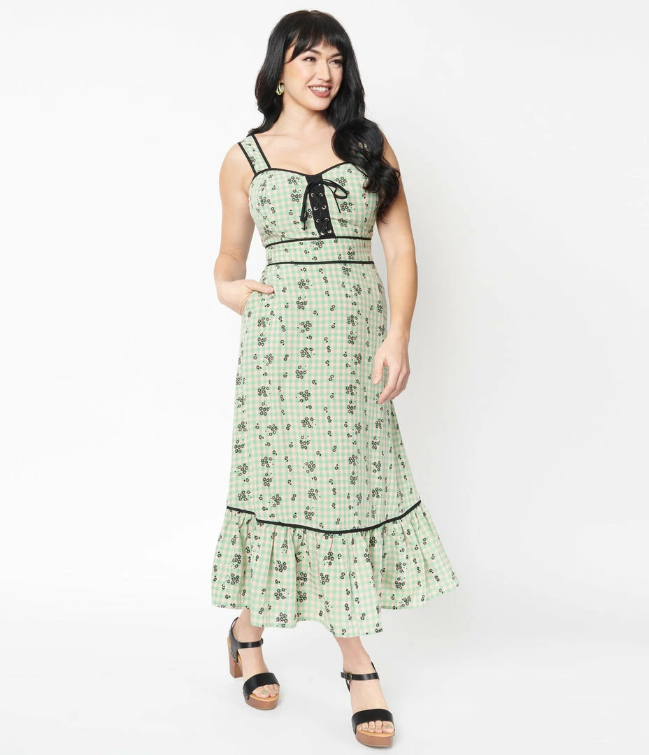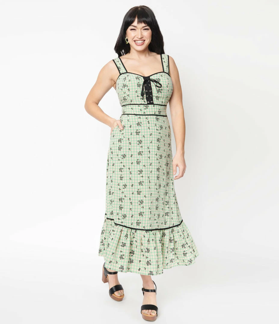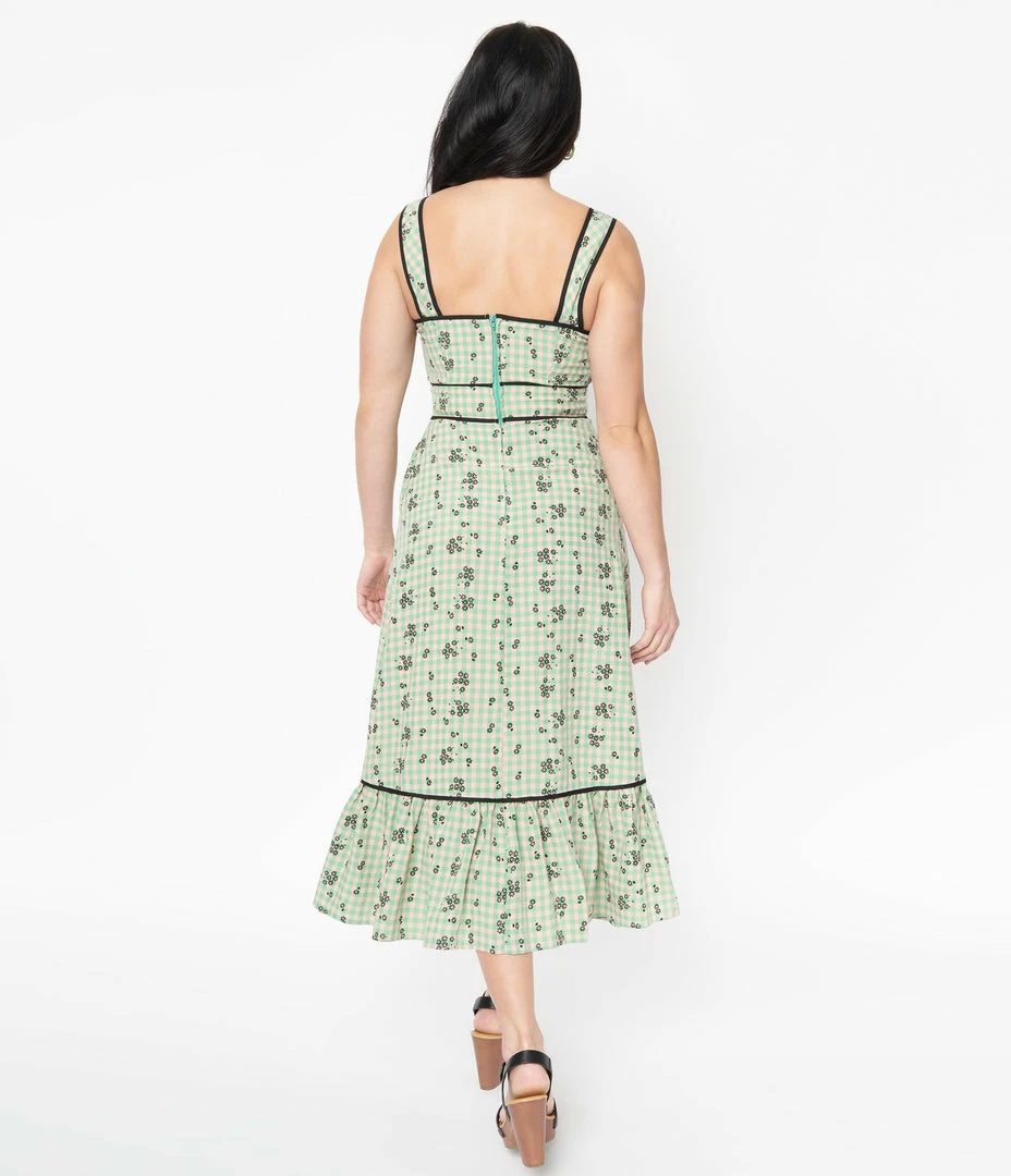 Take time to enjoy the flowers, dolls! This darling dress from Unique Vintage is crafted in a lightweight woven blend and boasts dainty black florals dancing throughout the green and beige gingham backdrop. The princess seamed bodice is trimmed in black piping and has a faux lace up accent that centers the sweetheart neckline, while the wide banded waist is cinched with a back zipper and secured with button adjustable straps. The midi length skirt drops into an adorable gathered ruffle along the hem and is outfitted with side pockets for a modern touch!