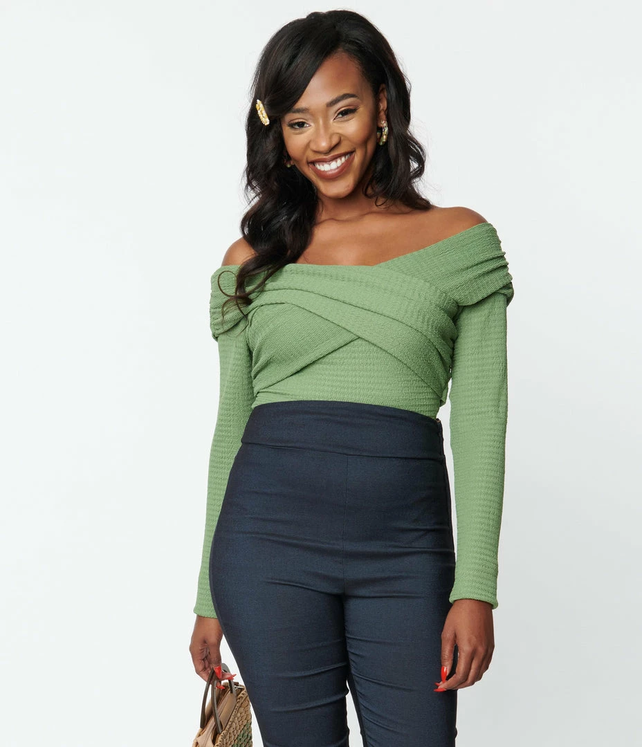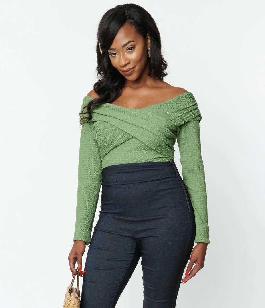 Smolder in this alluring bodysuit, crafted in a green textured knit. Featuring an off the shoulder neckline, long sleeves, and complete with a snap button closure.