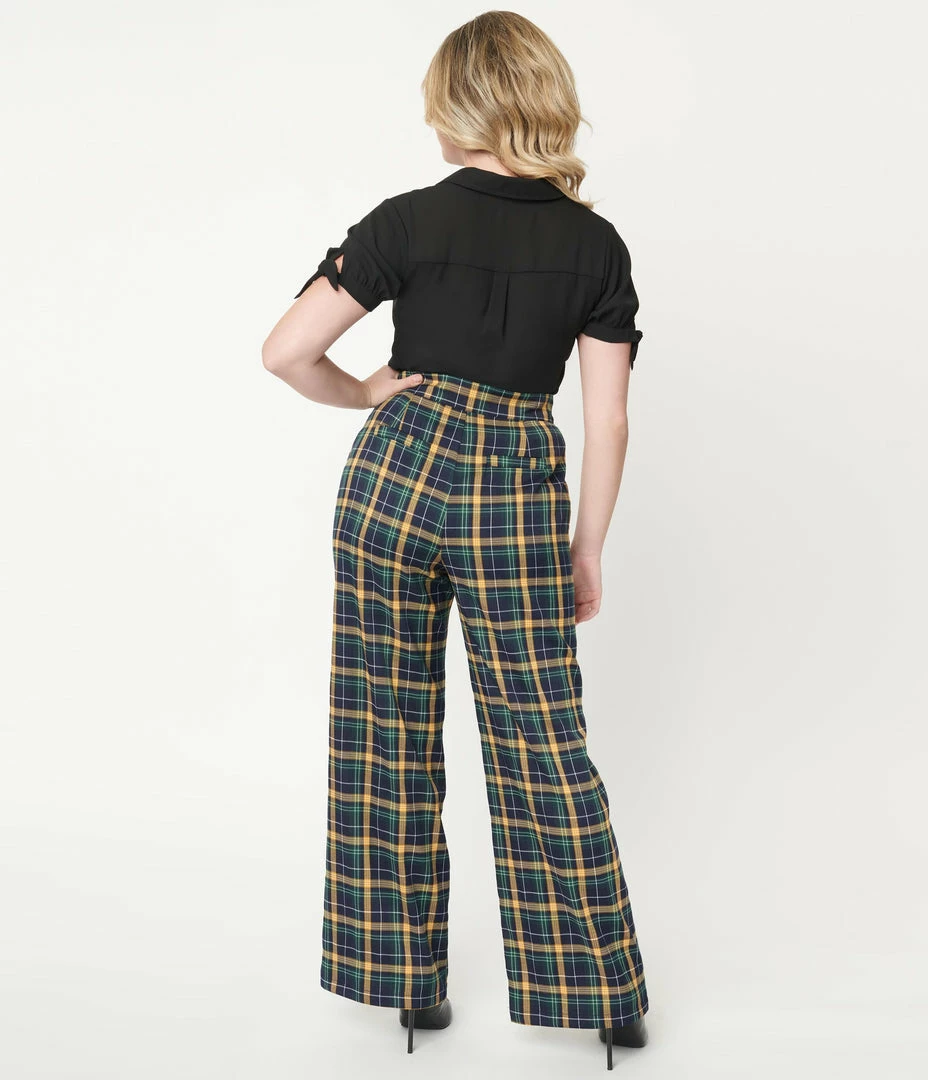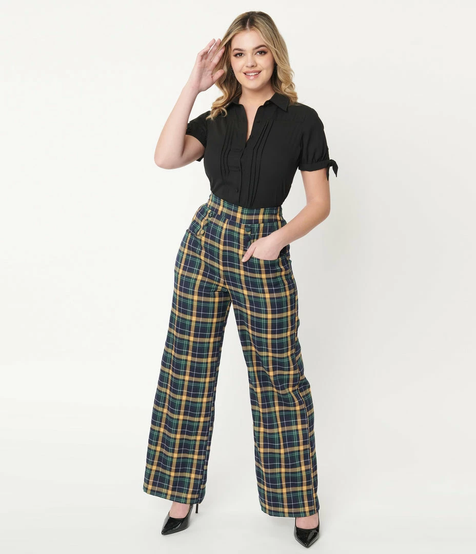 Get your sea legs under you, dears! A classic pair of sailor style slacks, the Ginger Pants from Unique Vintage are crafted in a lightweight woven fabric, complete in a striking 1950s vintage navy blue, emerald green, yellow, and white plaid pattern. A thick waistband rests easily at the natural waist, secured by a side zipper, with cute faux back pockets and faux buttons adding a charming nautical accent. The wide pant leg creates a powerful retro silhouette to slim and flatter, while deep side pockets allow you to stowaway your keepsakes!