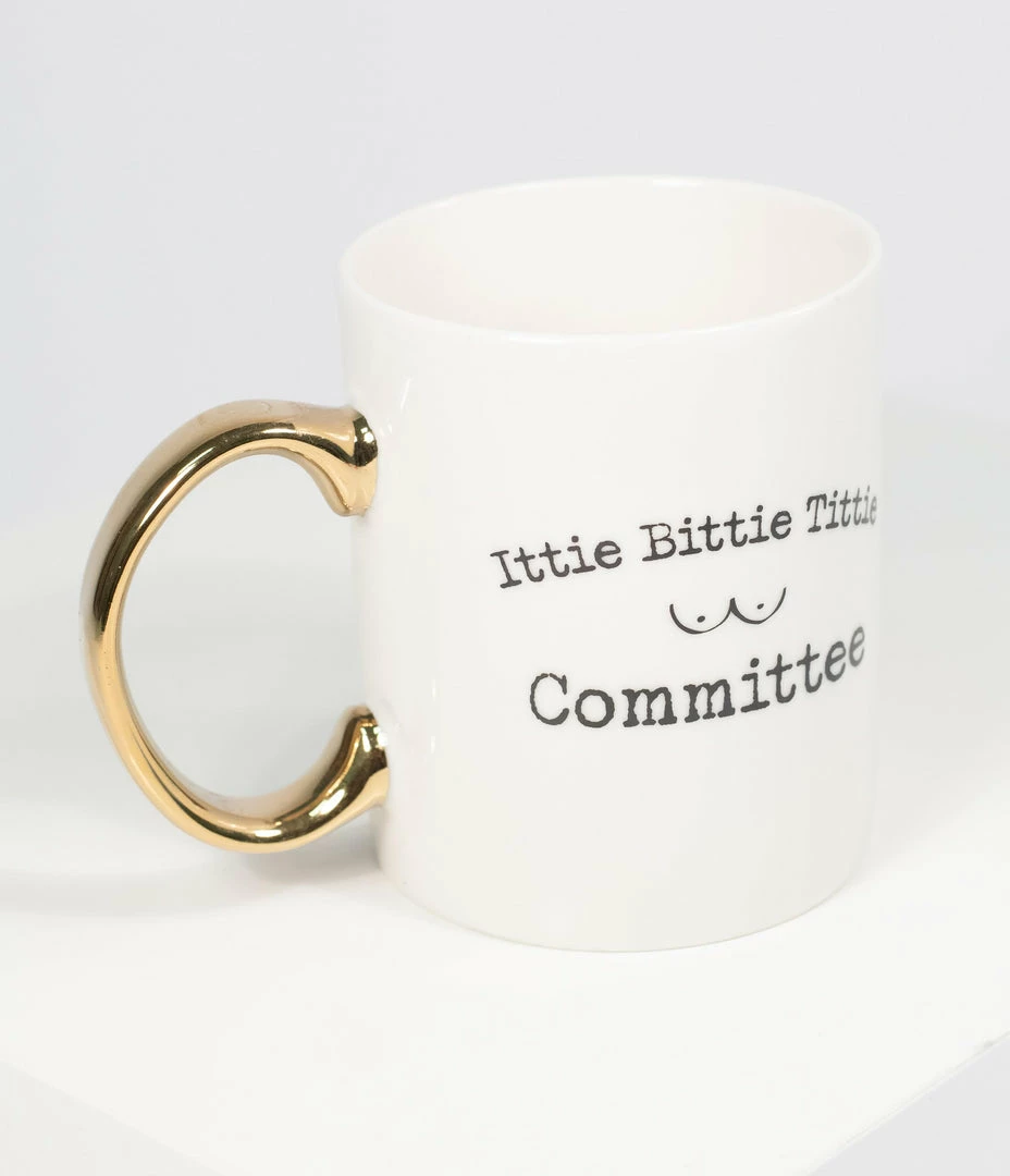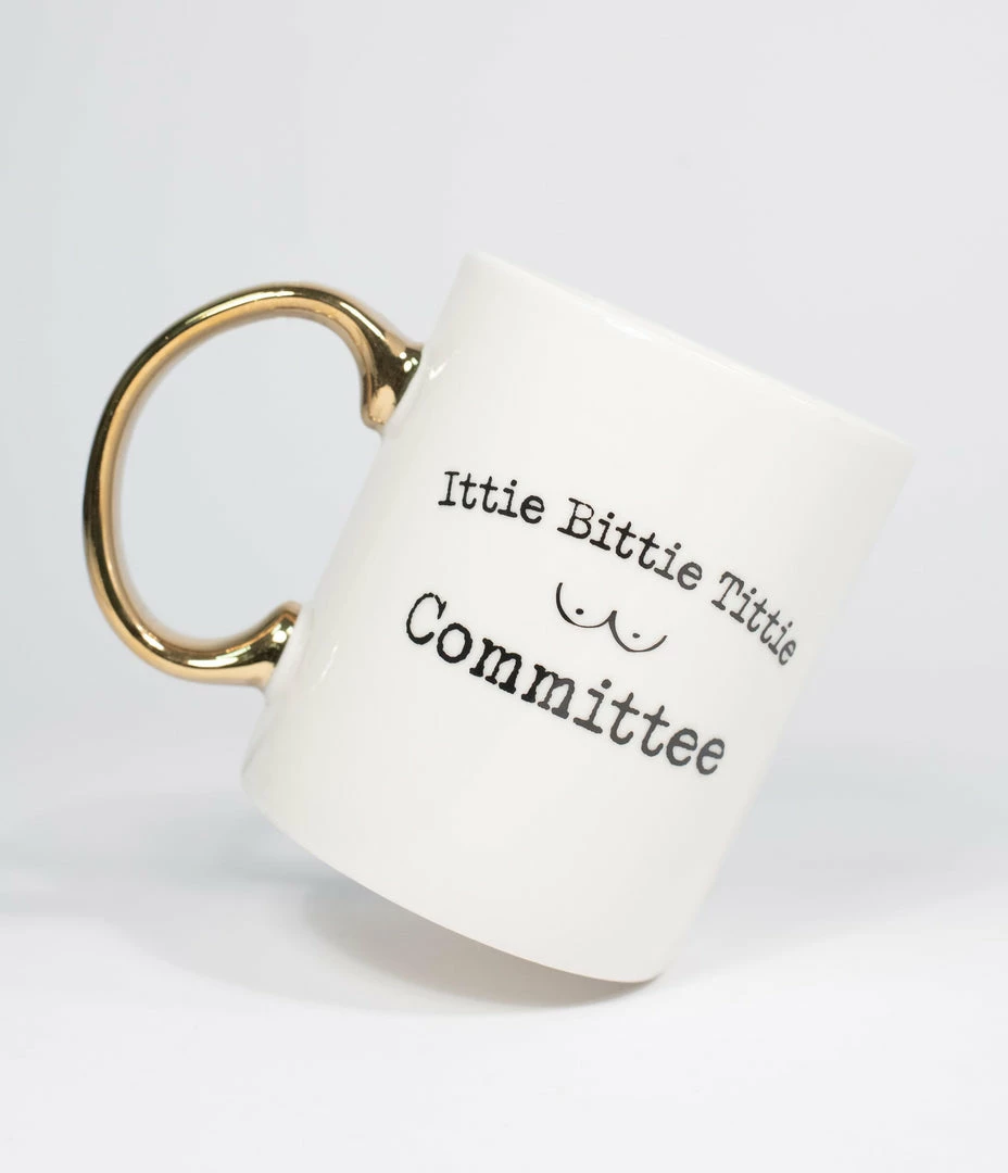 Youโre the president, darling! This cheeky ceramic mug features a saucy print of boobs with the words, โIttie Bittie Tittie Committeeโ throughout the ivory backdrop. With a gold handle, remind yourself how badass your titties are!