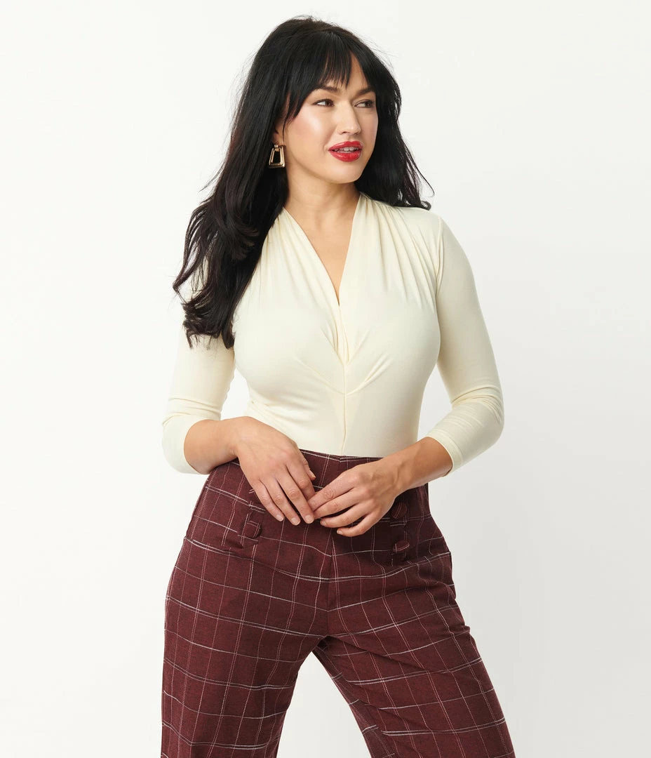 Friday is our favorite word, gals! This alluring ivory white bodysuit from Unique Vintage is crafted in a soft and sturdy stretch knit for a comfortable fit. The Friday Night Bodysuit boasts a sultry gathered V-neckline, framed by slender three-quarter length sleeves as the dual snap button closure makes this slimming separate pair easily with your favorite skirt or skinnies!