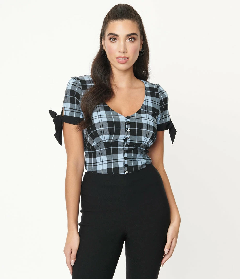 Budget 🌟 Unique Vintage Light Blue & Black Plaid Noreen Top Sale 🔥