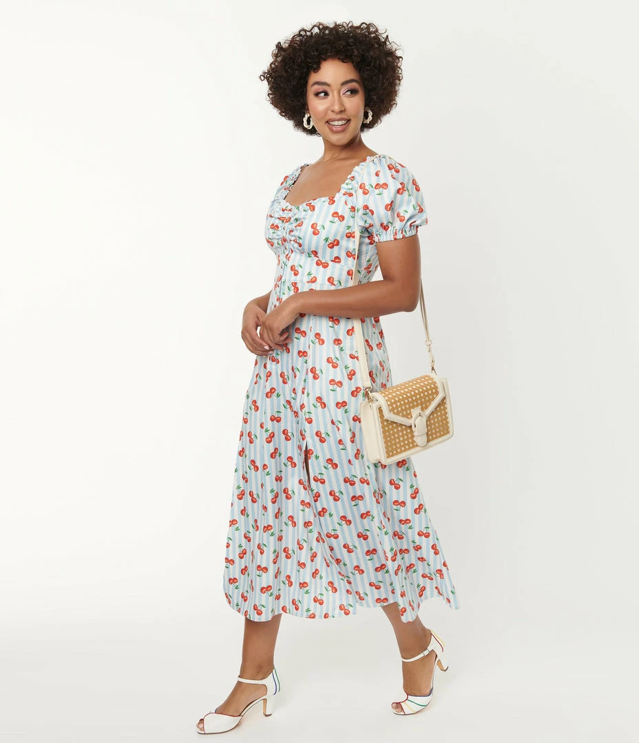 Discount 🤩 Unique Vintage Light Blue Stripe & Cherry Print Midi 👗 Dress Clothing ⌛