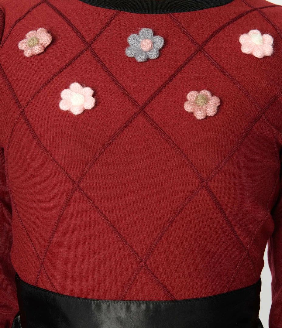 This adorable sweater is crafted in a soft merlot knit fabric with multicolor crochet florals accented along the neckline. The bodice boasts a sweet pintuck diamond design, framed by long sleeves.