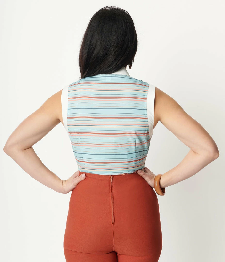 This blouse from Unique Vintage is crafted in a lightweight and smooth woven fabric that dances with a gorgeous striped pattern in mint, coral, beige, and blue throughout a classic silhouette. Complete with a button up front.