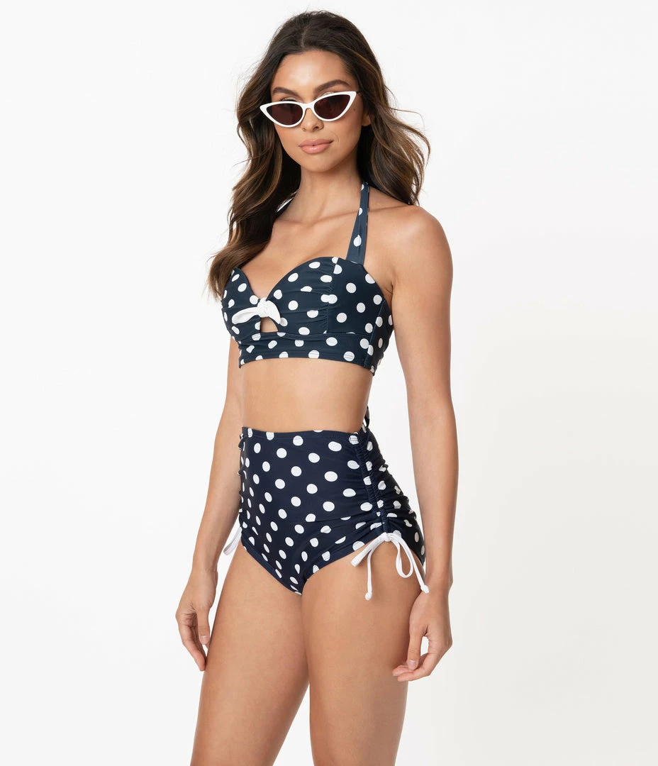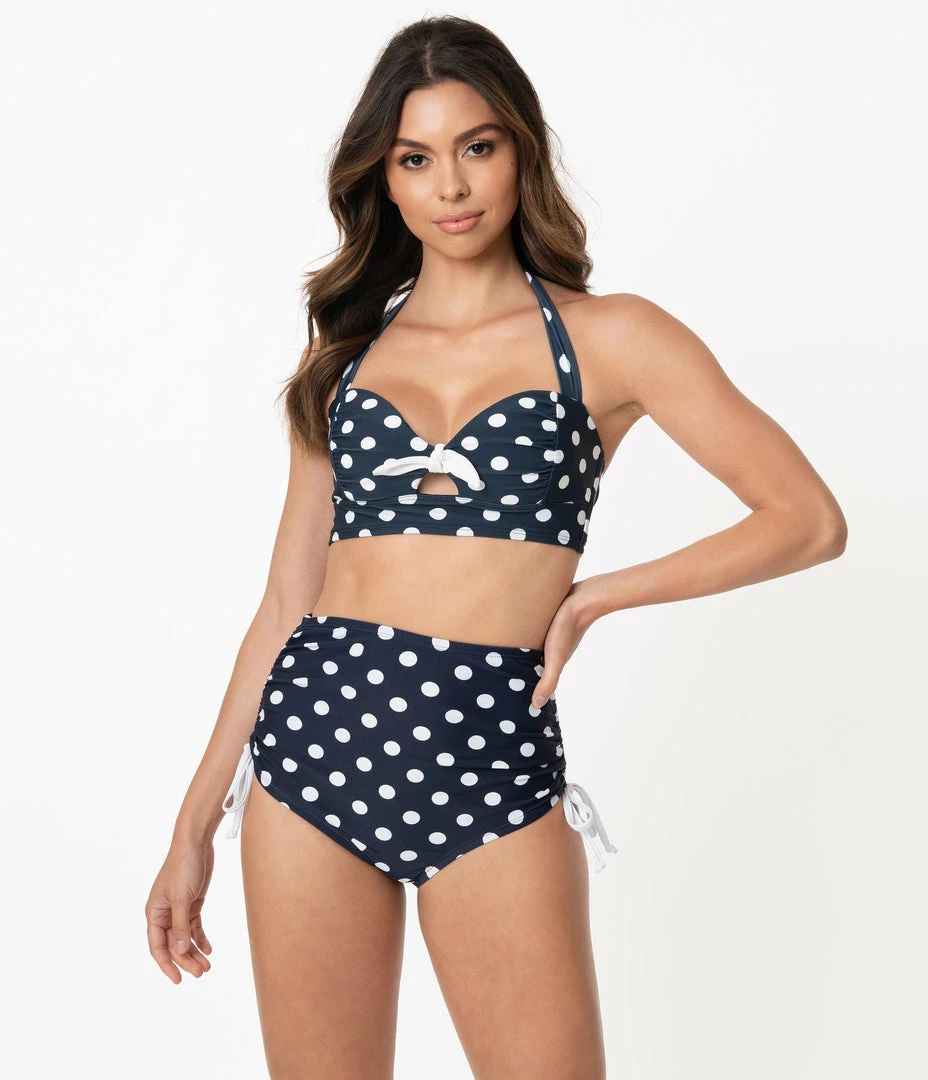 Wholesale 💯 Unique Vintage Mrs. West Navy Blue & White Polka Dot Halter Swim Top Swimwear 💯