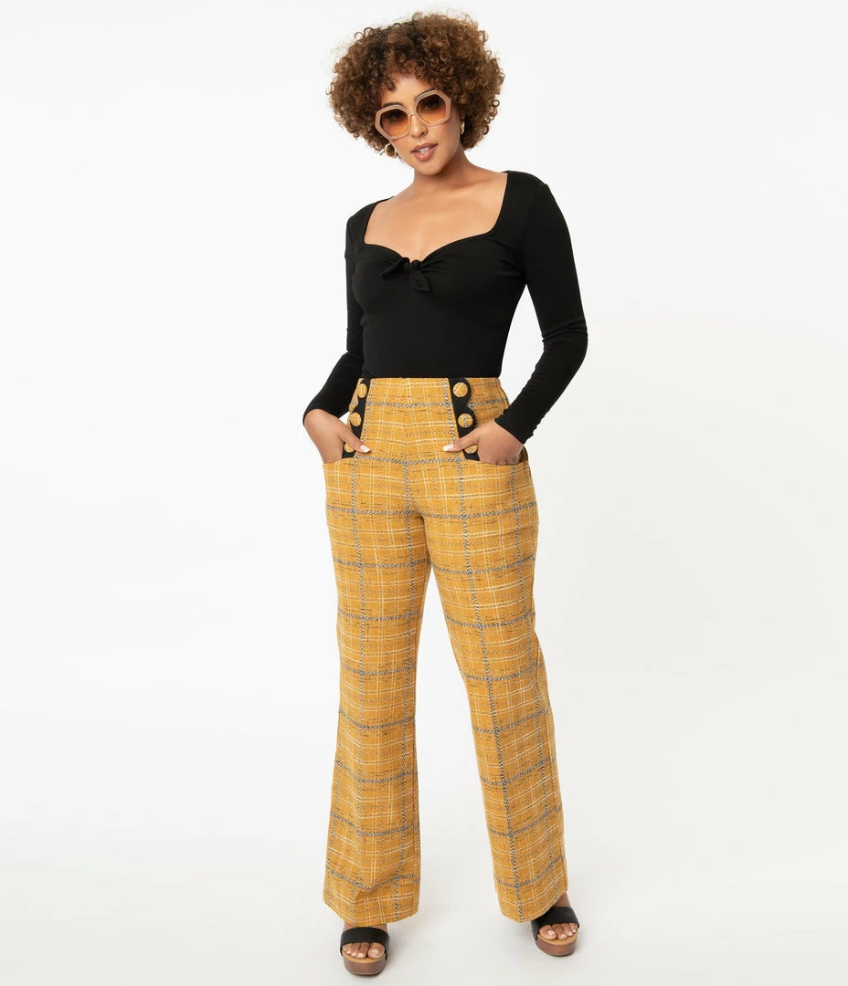 Who knew phenomenal could be deadly, darling? These fabulous high waist pants from Unique Vintage are a beautiful separate crafted in a sturdy woven mustard yellow and black plaid. The Rogers Pants boast a fabulous wide leg that swishes around your ankles while the sweet side pockets provide modern function. Adorable faux buttons and black fabric scallops lend retro styling along the pockets while a side zipper nips in your form. Pay homage to this leading lady!