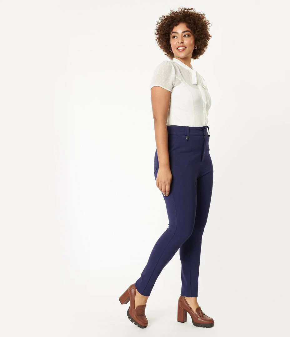 Give ‘em a purr, dolls! A ravishing pair of cigarette pants from Unique Vintage, the Kitty Pants are crafted in a sturdy stretch blend that hugs your feminine features in solid navy blue. The banded waist is nipped with a front zipper and button while dainty faux button tabs are designed as belt loops to pair with your favorite cinch. The skinny fit legs are outfitted with side and back pockets for modern convenience!