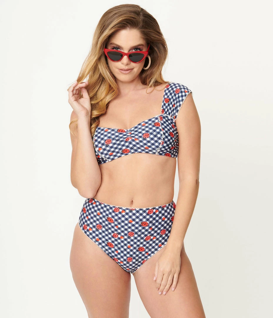 Best Sale โ๏ธ Unique Vintage Navy Gingham & Ladybug Print Daphne Swim Bottoms ๐