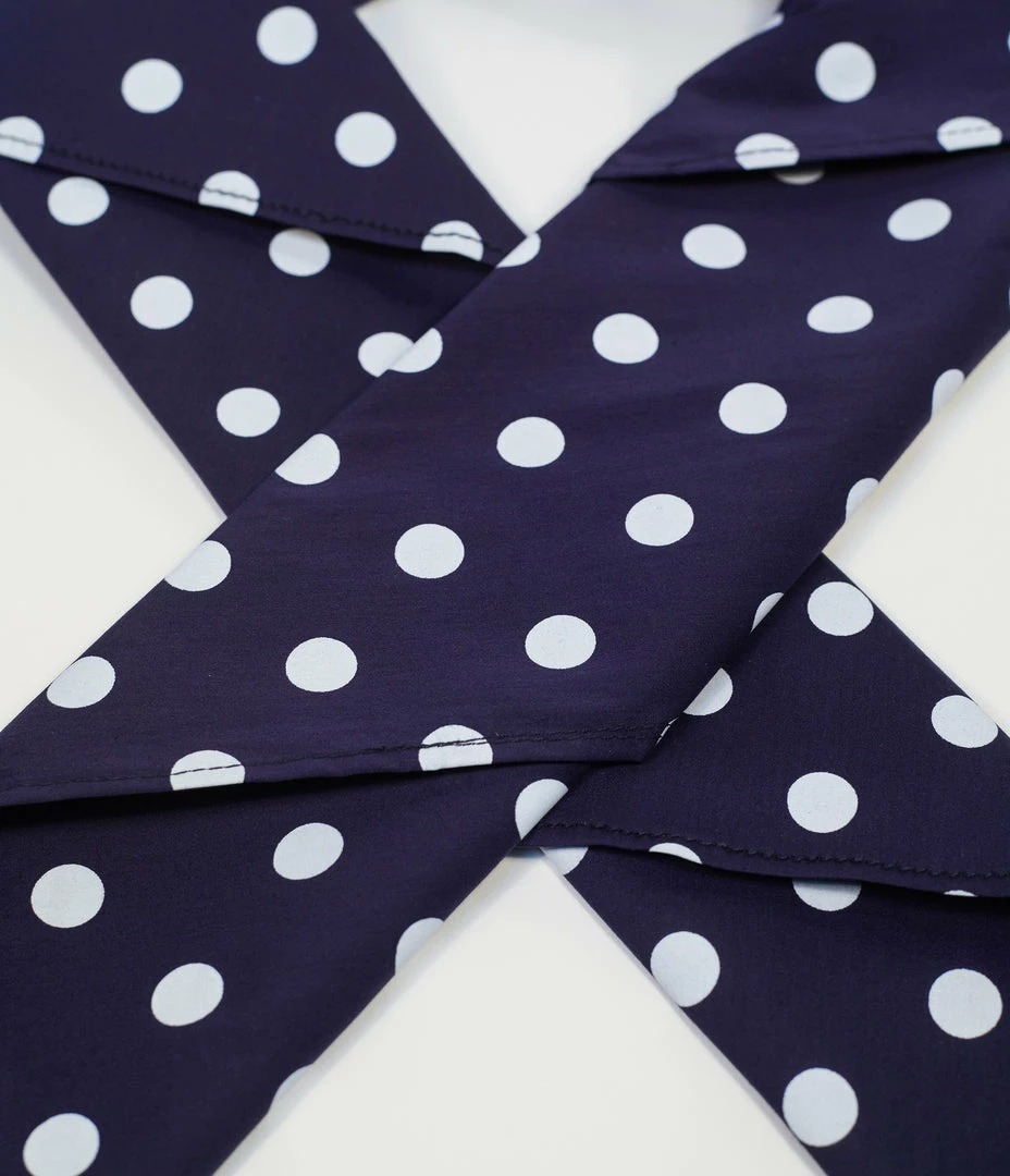 Complete your adorable pin-up presentation with this fabulous hair scarf from Unique Vintage, boasting a bevy of white polka dots throughout a navy blue backdrop! A silky vintage inspired chiffon scarf perfect for tying up and around your divine ‘do – any excuse for a little sky-high hair help!