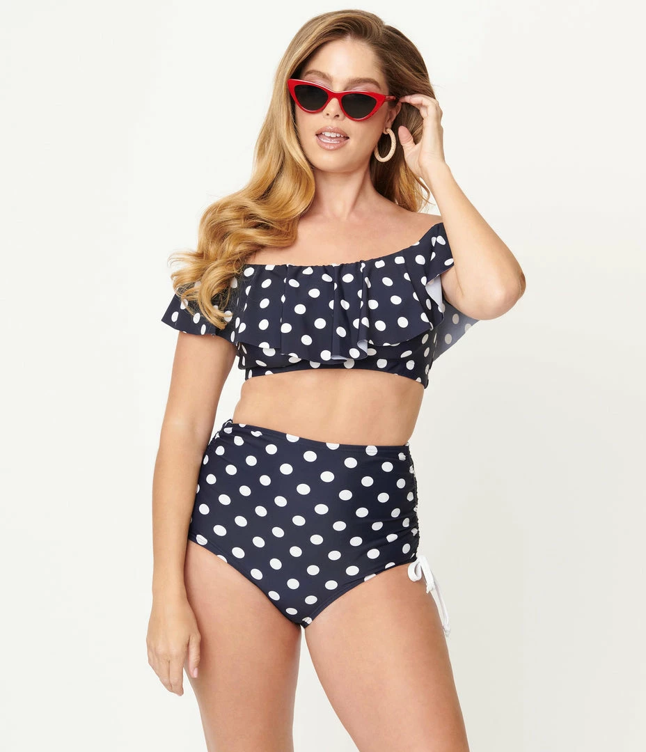 Cheap 🛒 Unique Vintage Navy & White Polka Dot Ruffled Ramona Swim Top Swimwear 🎉