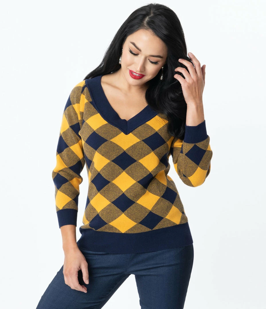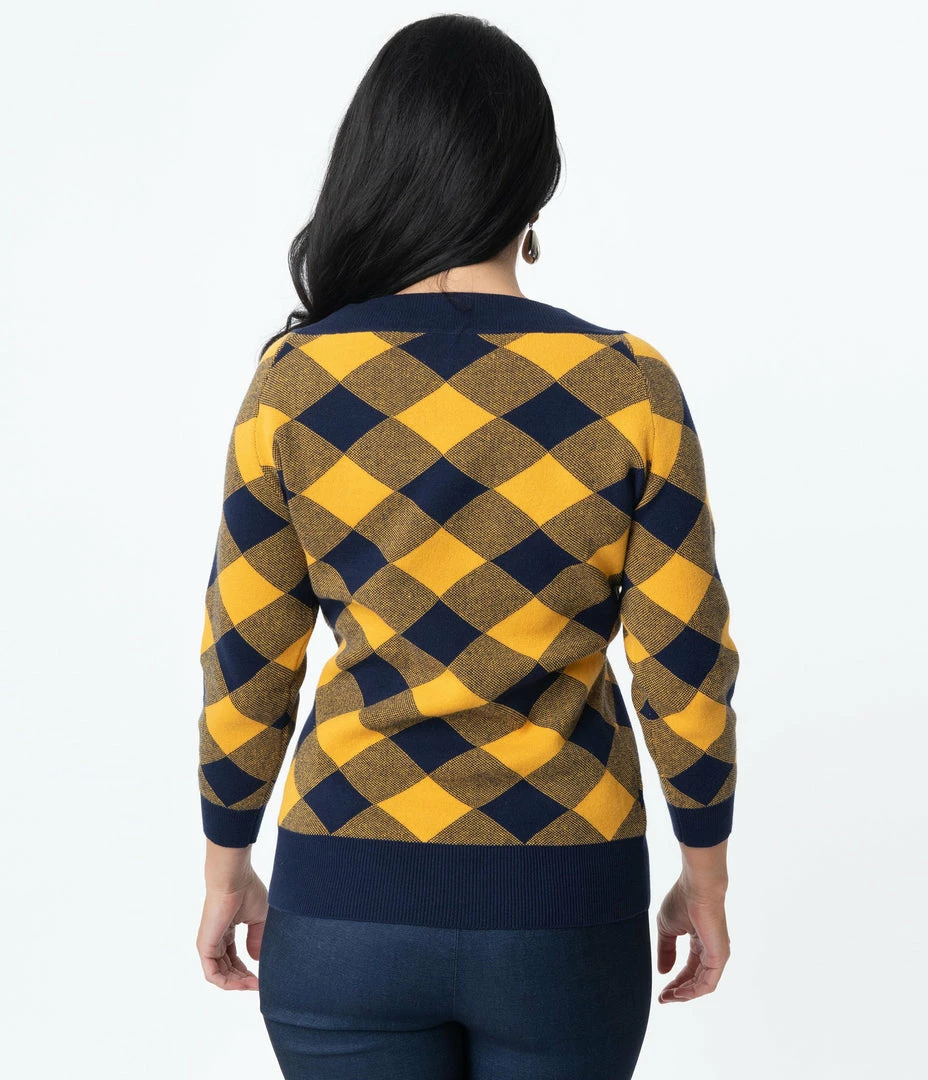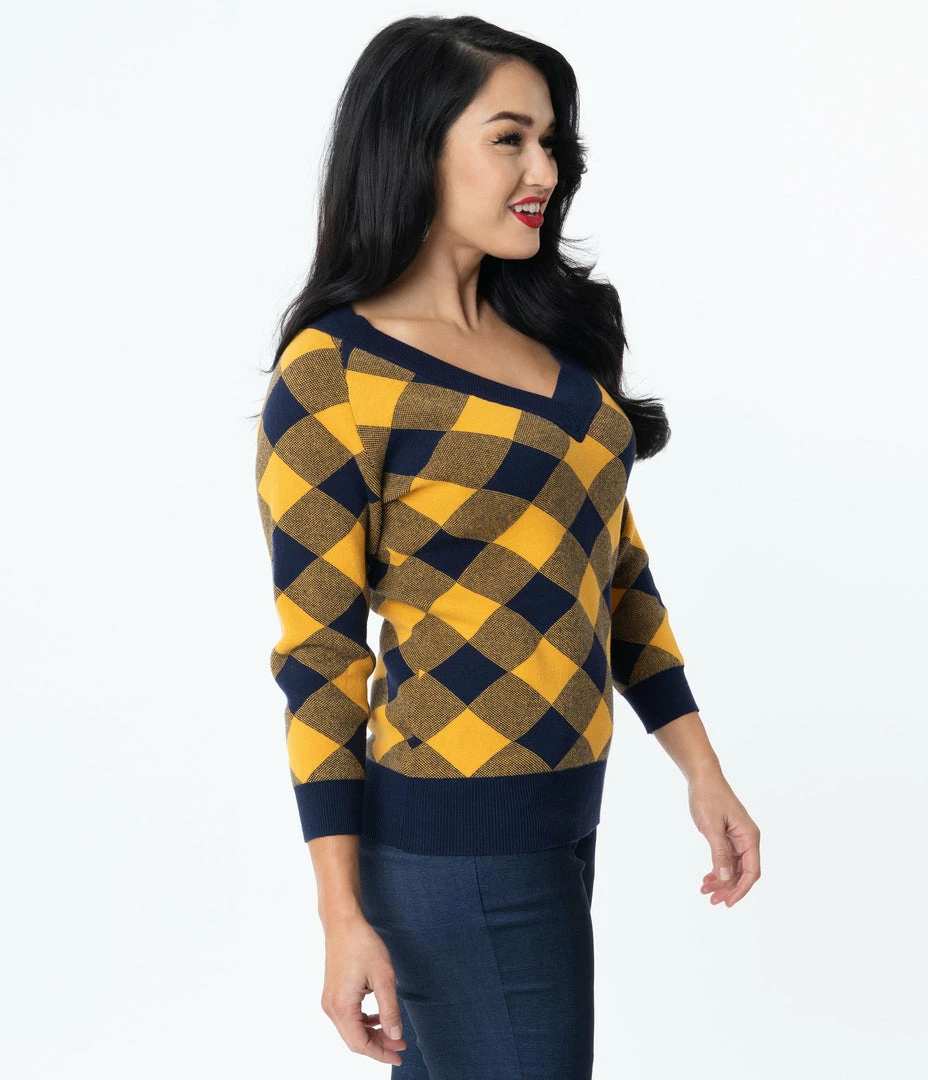 Fearless equals powerful, dears! A bold and sassy separate from Unique Vintage, the Shelly Sweater is crafted in a marvelous knit that dances with a flattering navy blue and yellow plaid pattern. The modest V-neckline is framed by three-quarter length sleeves while the stay-in-place hem keeps you cozy as you work their hearts!