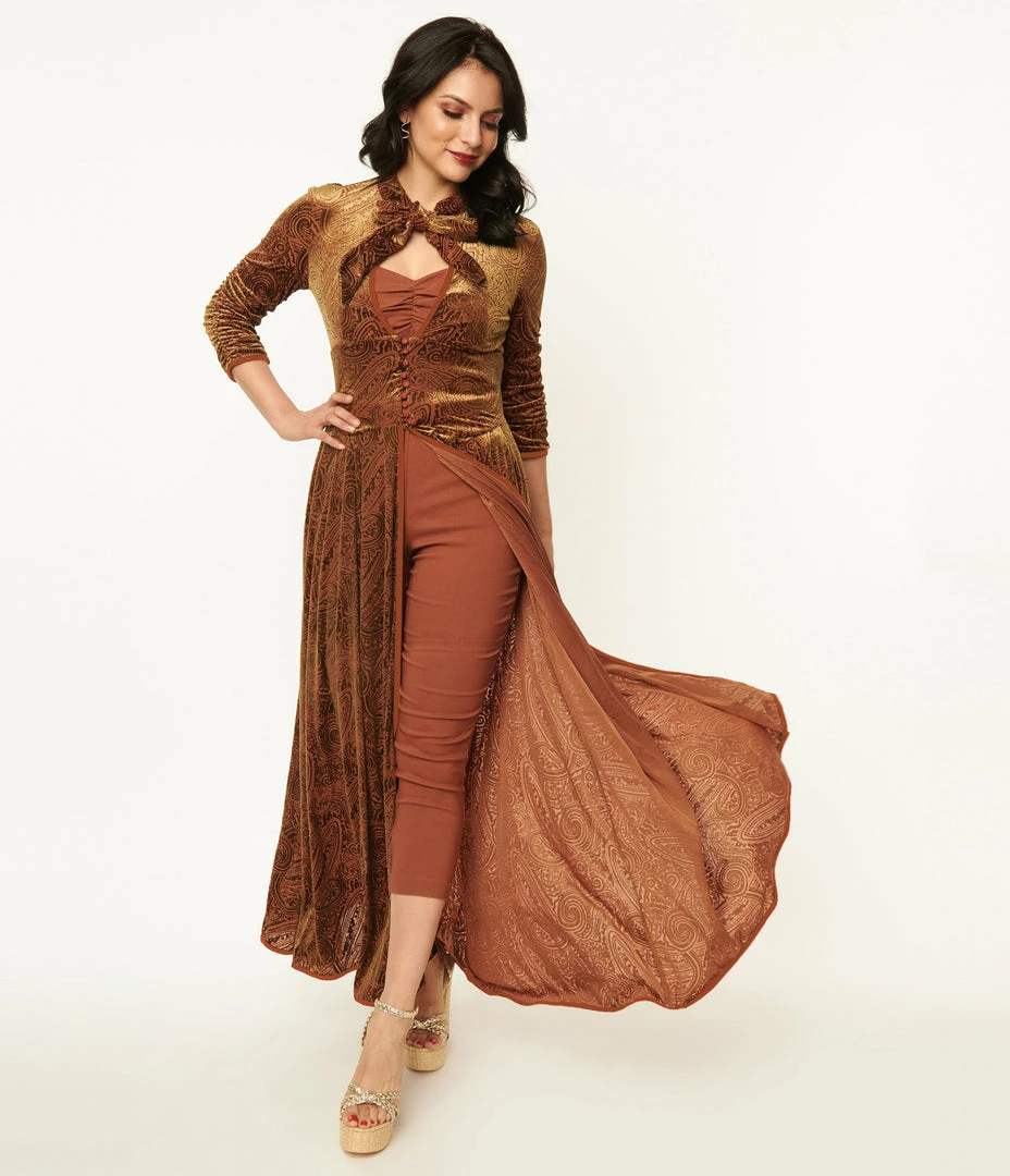 This dramatic duster is crafted in a rust and olive green devorรฉ velvet that dances with a paisley pattern. Outfitted with a self tie neck bow, three-quarter length sleeves, and a button up waist. Pair with a jumpsuit for a jaw-dropping opening act!