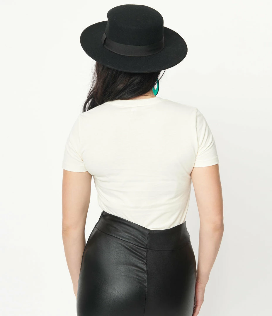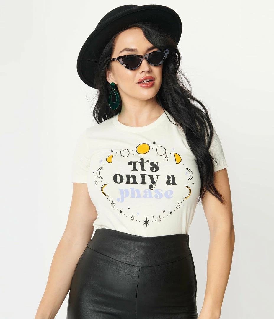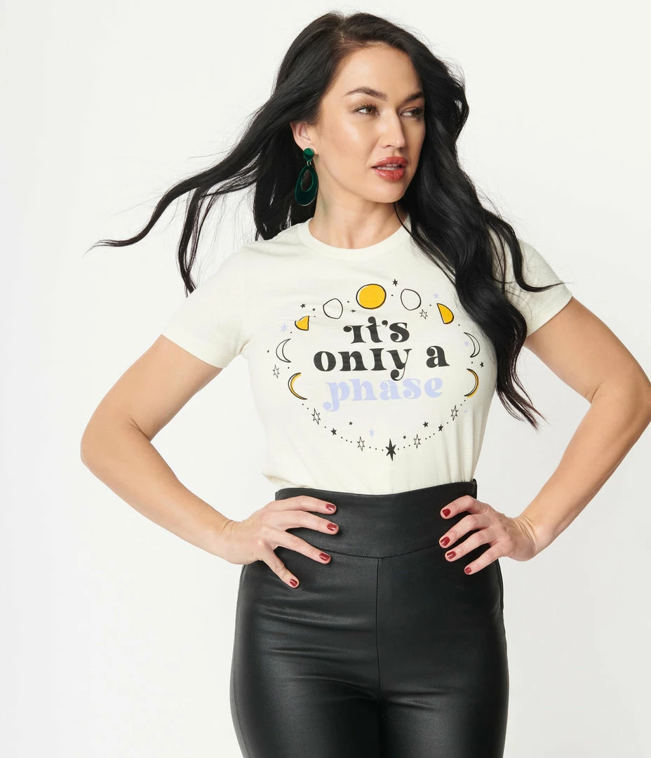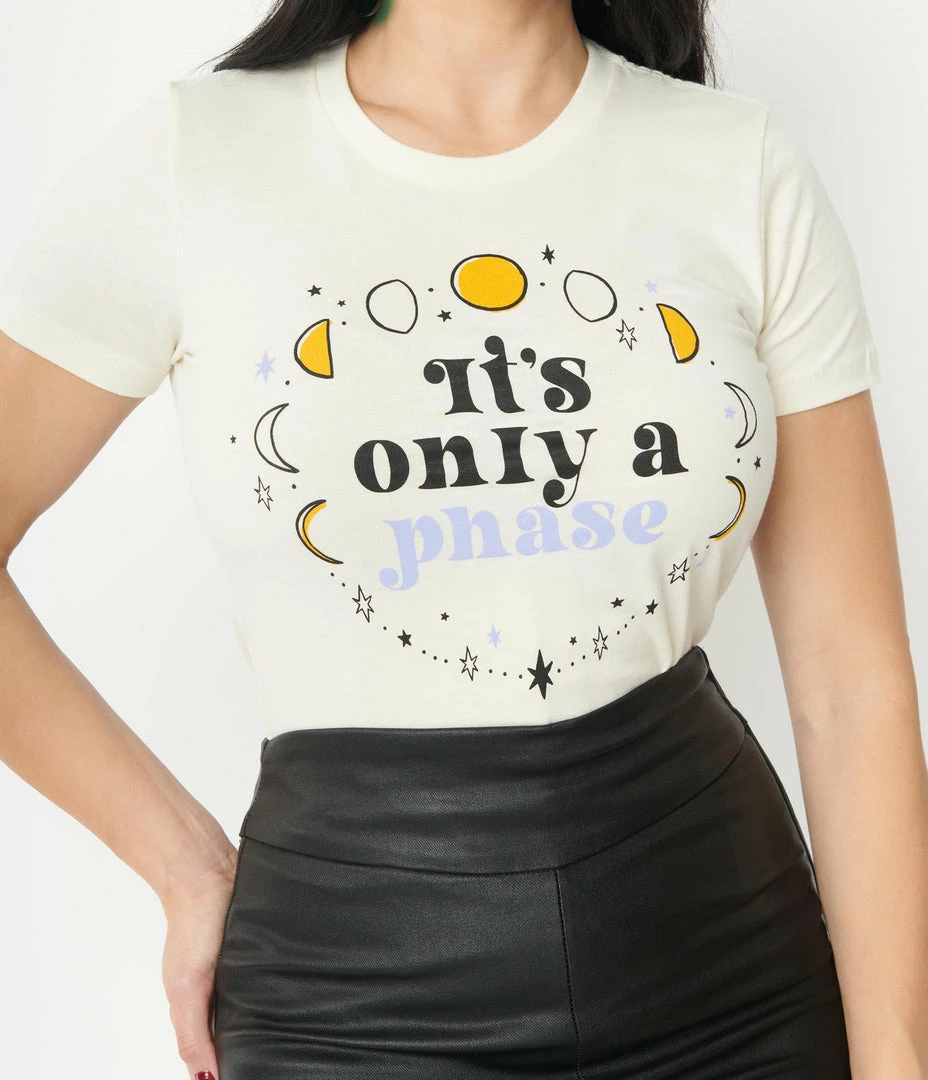 Shine light back at ‘em, dolls! This sassy women’s tee from Unique Vintage is crafted in cream cotton and features a screen print of the phases of the moon with the font, ‘It’s Only A Phase’. Complete in a fitted style with a crew neckline and short sleeves!