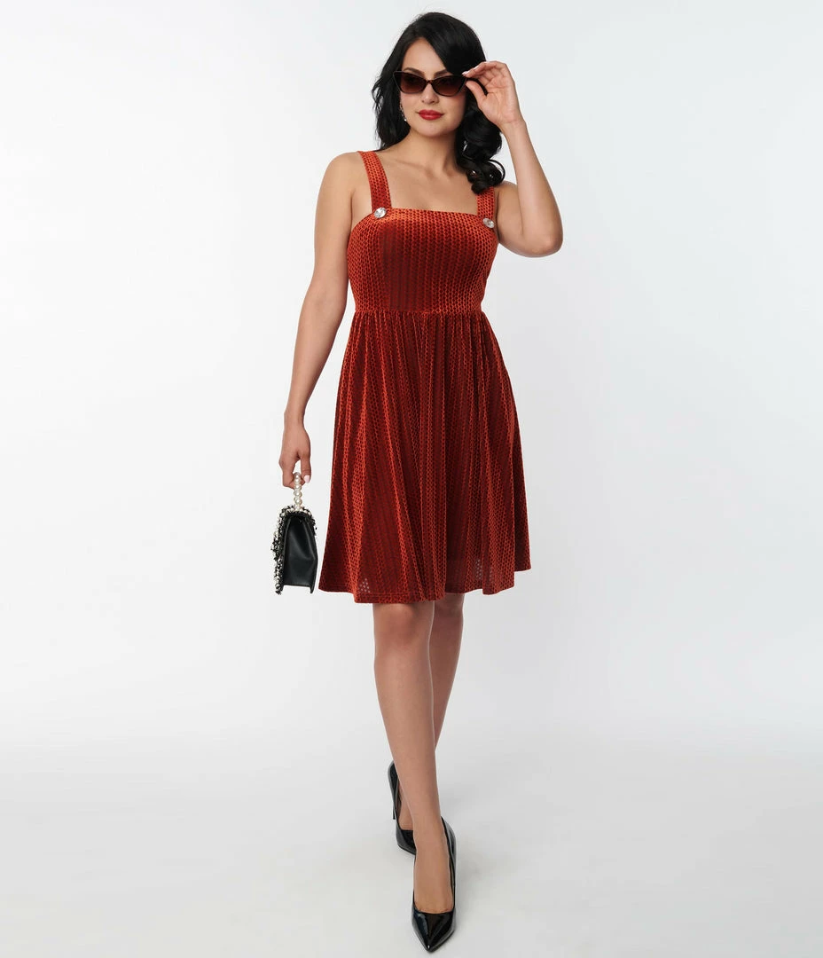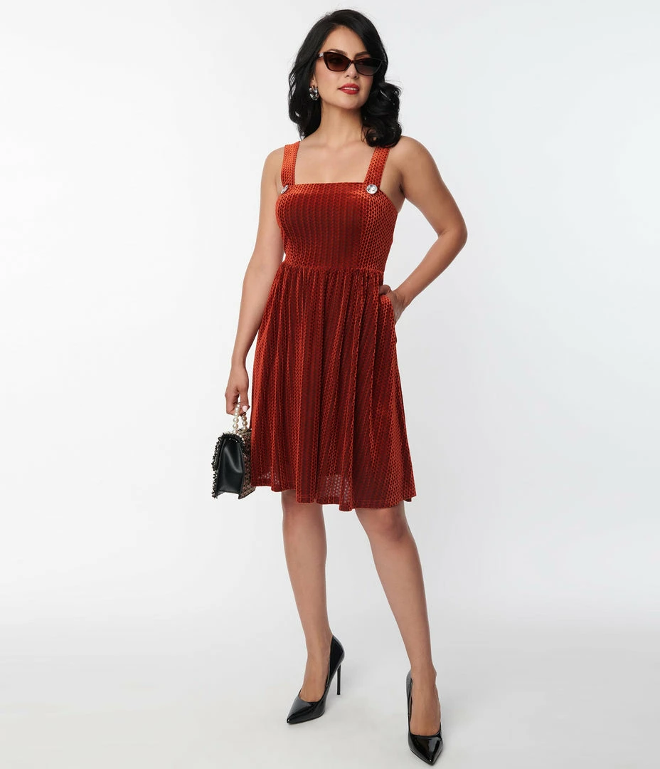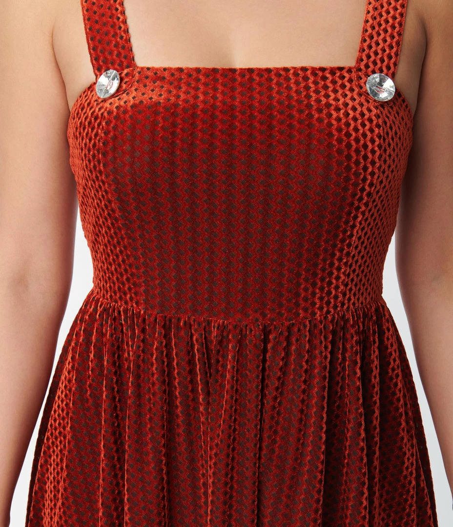 This adorable pinafore swing dress is crafted in a gorgeous orange velvet boasting a diamond shaped honeycomb burnout pattern throughout. The sleeveless straps are accented with faux buttons, while the swing skirt is outfitted with side pockets.