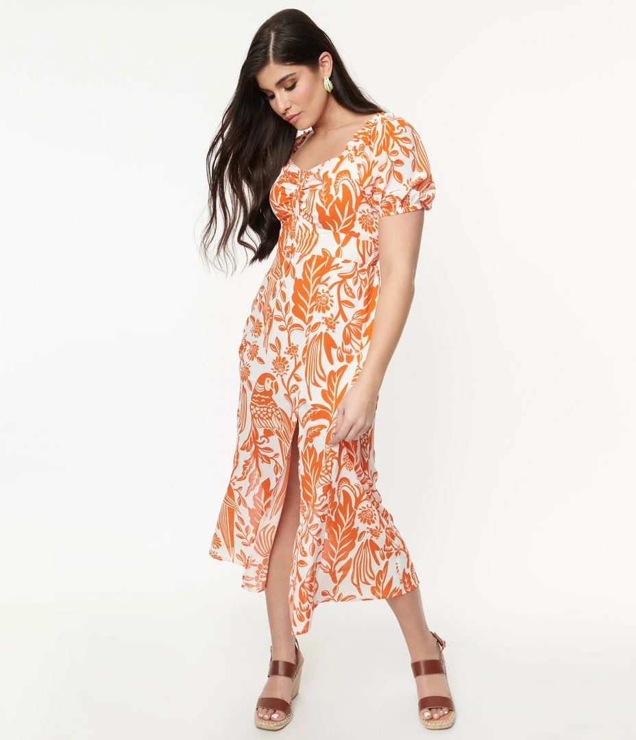 A stunning piece for frolicking through life, the Wild Hearts Run Free Dress from Unique Vintage is crafted in a lightweight woven fabric that dances with bright orange tropical florals and parrots printed throughout the white backdrop. The sweetheart neckline is framed by short Bardot sleeves while a partial button up placket and smocked back waistband nips in your figure. The sweeping midi skirt drops past your knees while dual front vents lend a flirtatious embellishment!