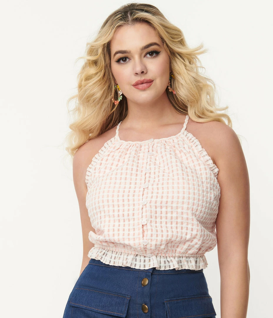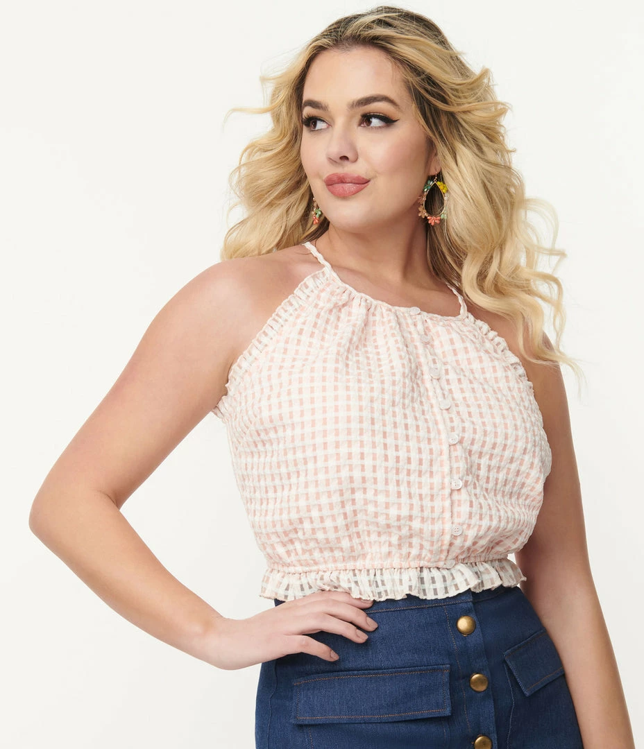 This charming blouse is crafted in a lightweight woven fabric that dances with a textured peach and white gingham throughout. The halter style neckline shows off your shoulders while the button up front gleams with pearlescent buttons. The elastic hem lends a sweet crop silhouette!